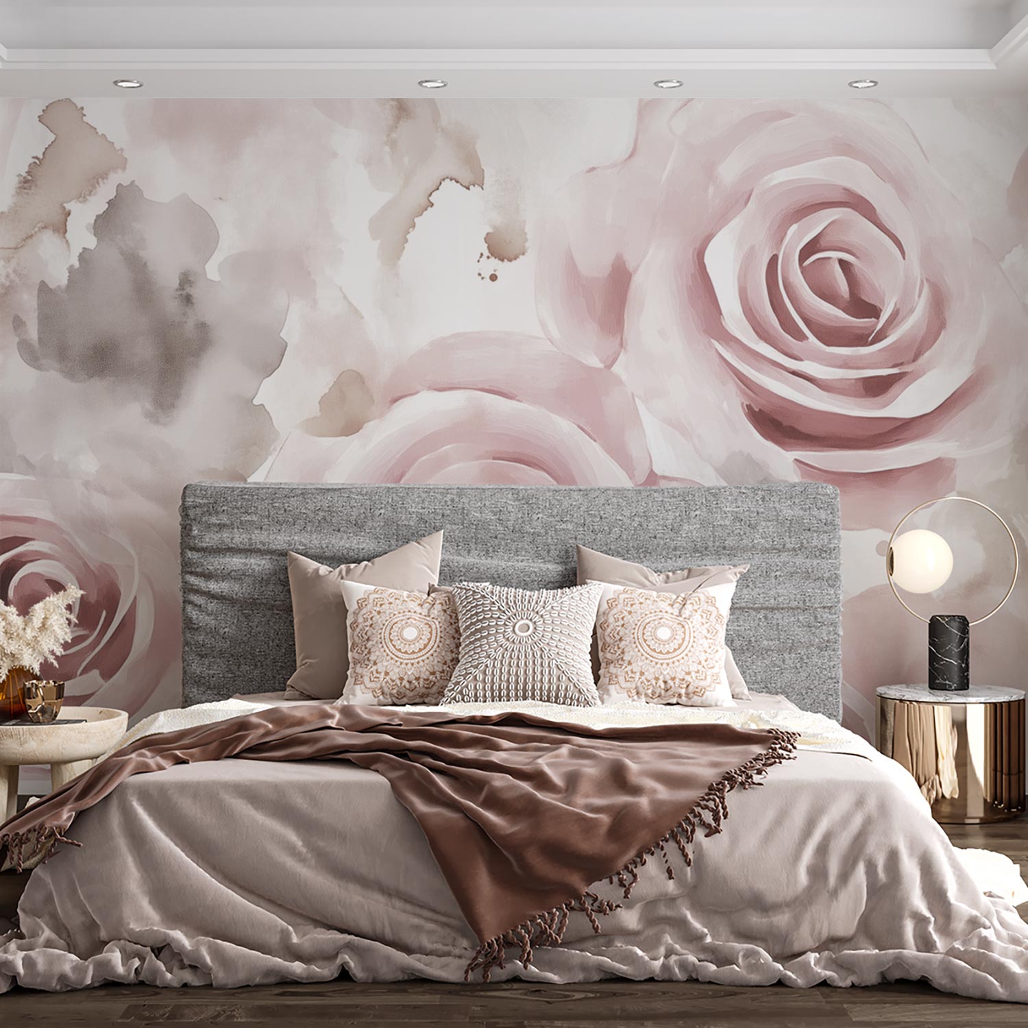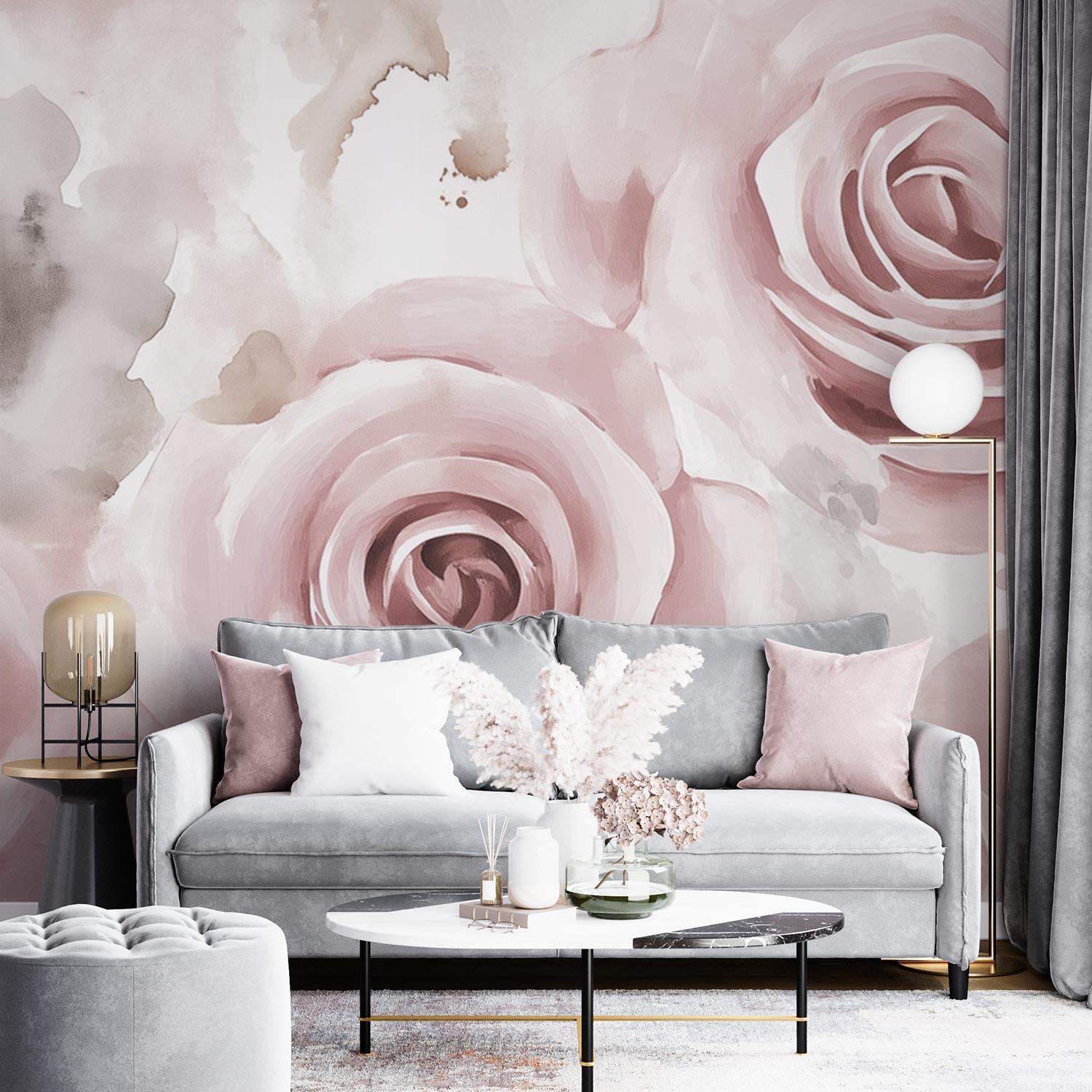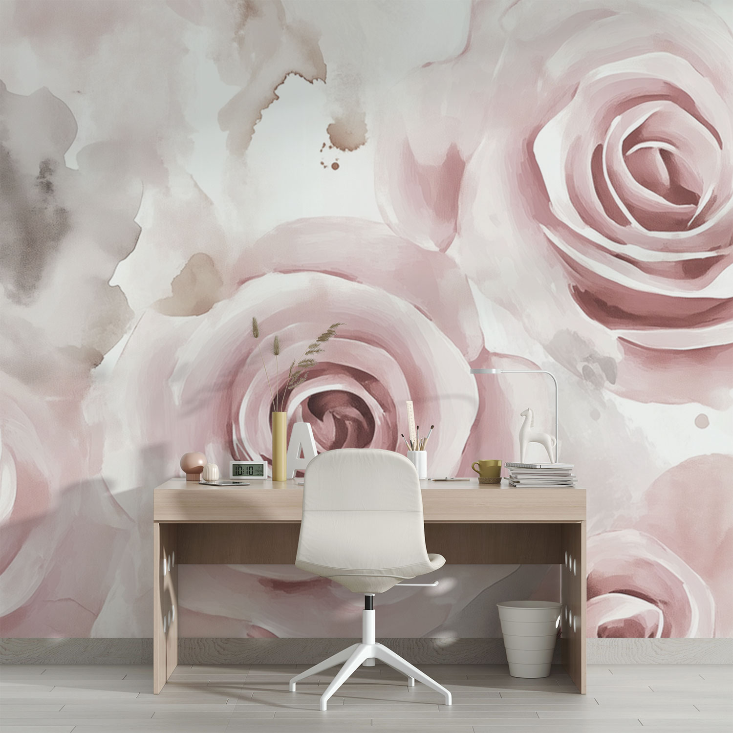 Zachte roze tinten vloeien sierlijk samen als waterverf, waarbij tedere rozenknoppen tot leven komen met een bijna tastbare elegantie. Elk bloemblaadje danst zachtjes in de compositie, omarmd door een romantische achtergrond die rust uitstraalt. Dit behang brengt de tijdloze charme van de natuur in huis en transformeert elke ruimte in een oase van serene schoonheid.