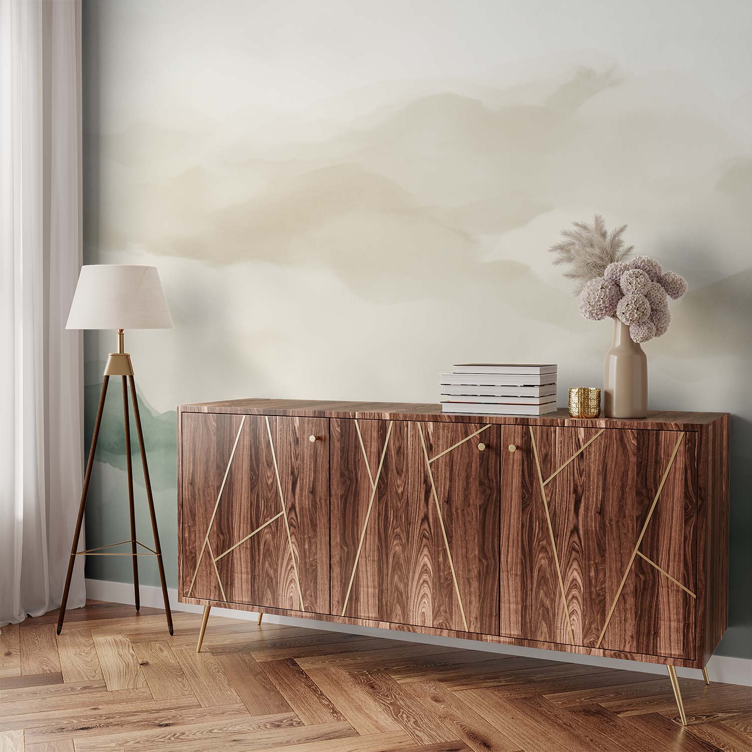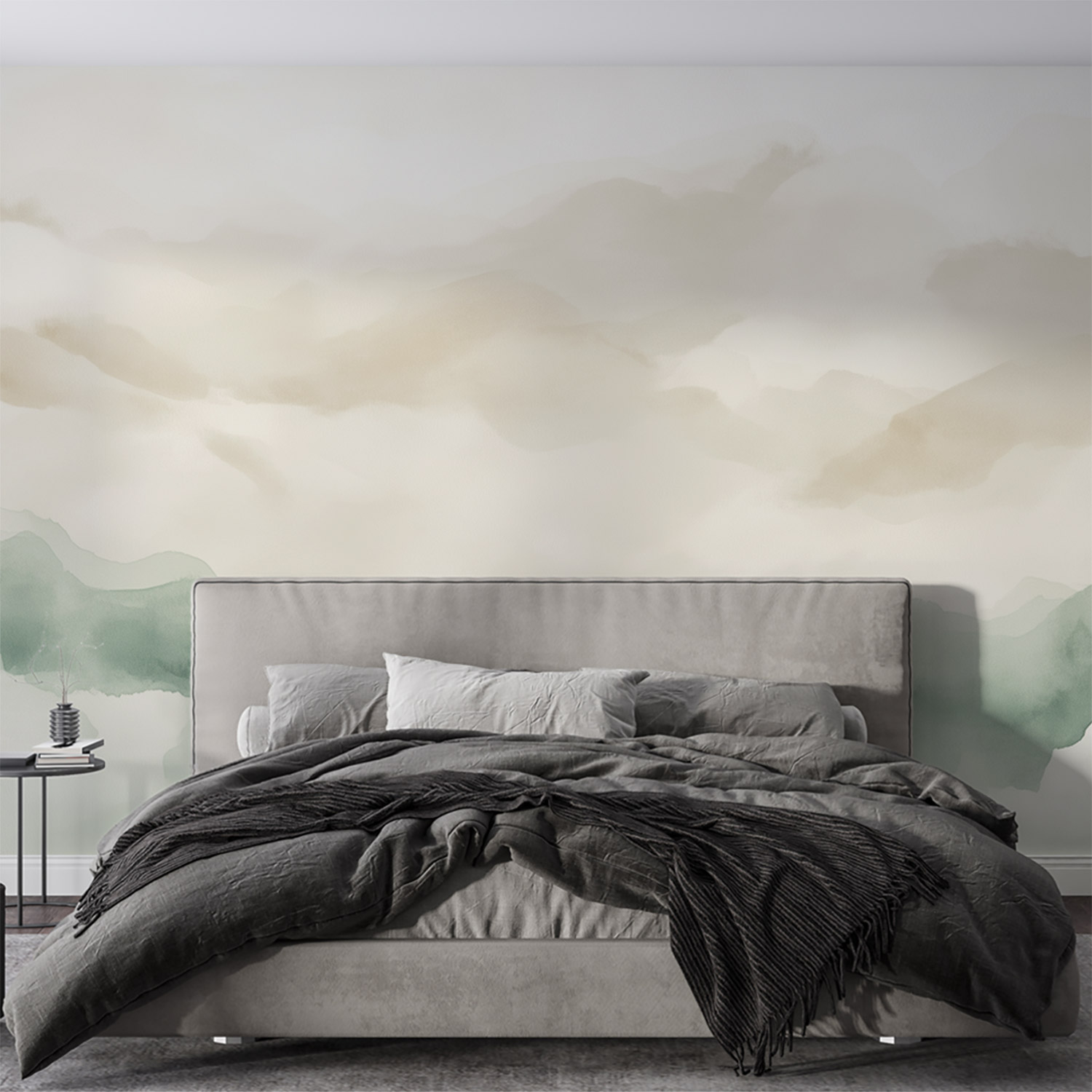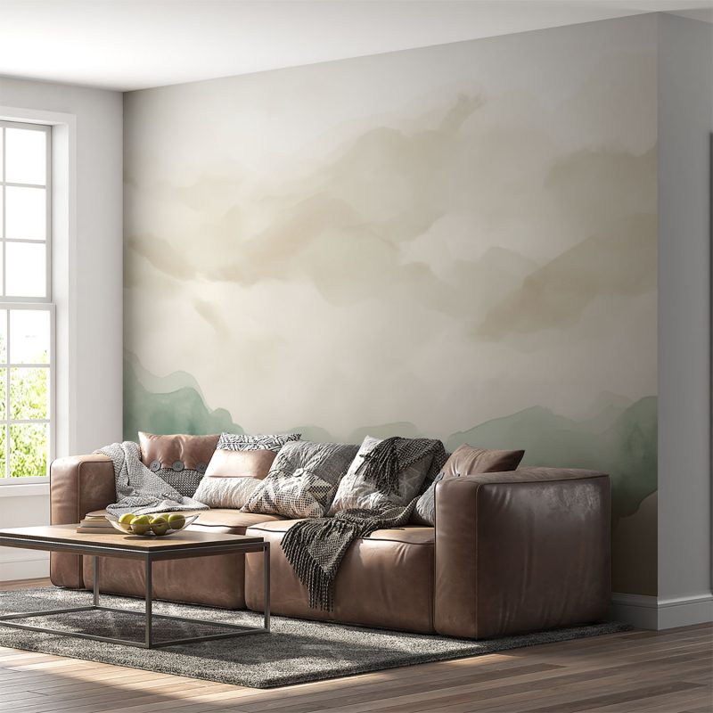 Zachte waterverf tinten dansen in harmonieuze groene en beige tonen, als een ademende levende entiteit. Dit behang brengt een kalmerende diepte in je ruimte, waar kleuren zachtjes in elkaar overvloeien en een serene sfeer creëren. Perfect voor interieurs die verlangen naar een vredige retreat, het transformeert muren in een contemplatief kunstwerk dat zowel rust uitstraalt als visuele interesse toevoegt.