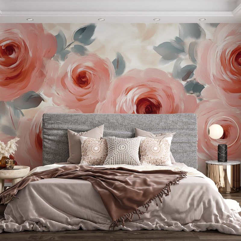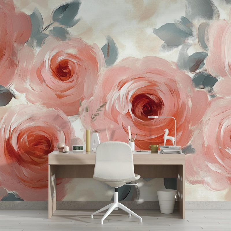 Verfijnde roze rozen dansen over een zacht beige achtergrond, hun groene bladeren vormen een levendig contrast. Elk bloemblad lijkt te zinderen met een schilderachtige zachtheid die rust uitstraalt. Dit behang brengt de serene schoonheid van een bloeiende tuin naar binnen, perfect voor een ruimte die verlangt naar natuurlijke elegantie en kalme harmonie.