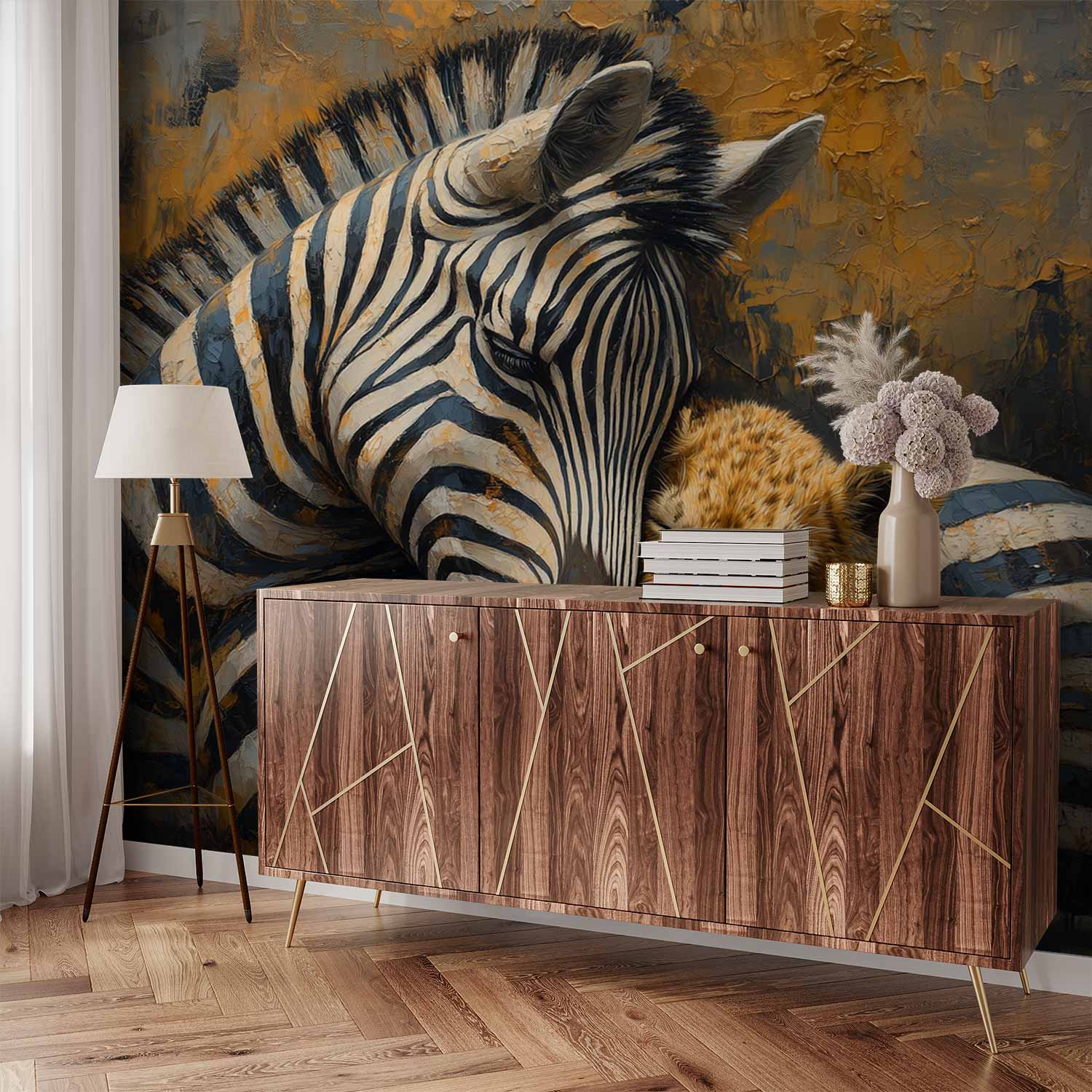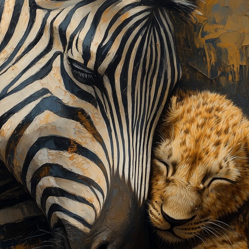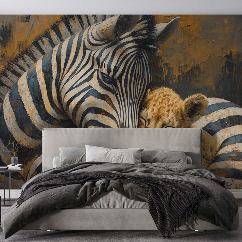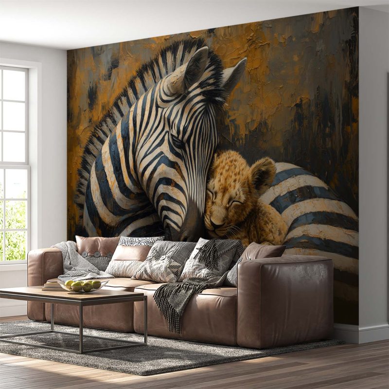 Warme tinten bruin en zwart-wit vloeien zacht in elkaar over. Een zebra en luipaardwelpje omarmen elkaar teder in deze dromerige impressie. Hun innige band straalt rust en geborgenheid uit. Dit sfeervolle behang brengt een hartverwarmende, kalmerende energie in je interieur, perfect voor een ruimte waar genegenheid en sereniteit centraal staan.