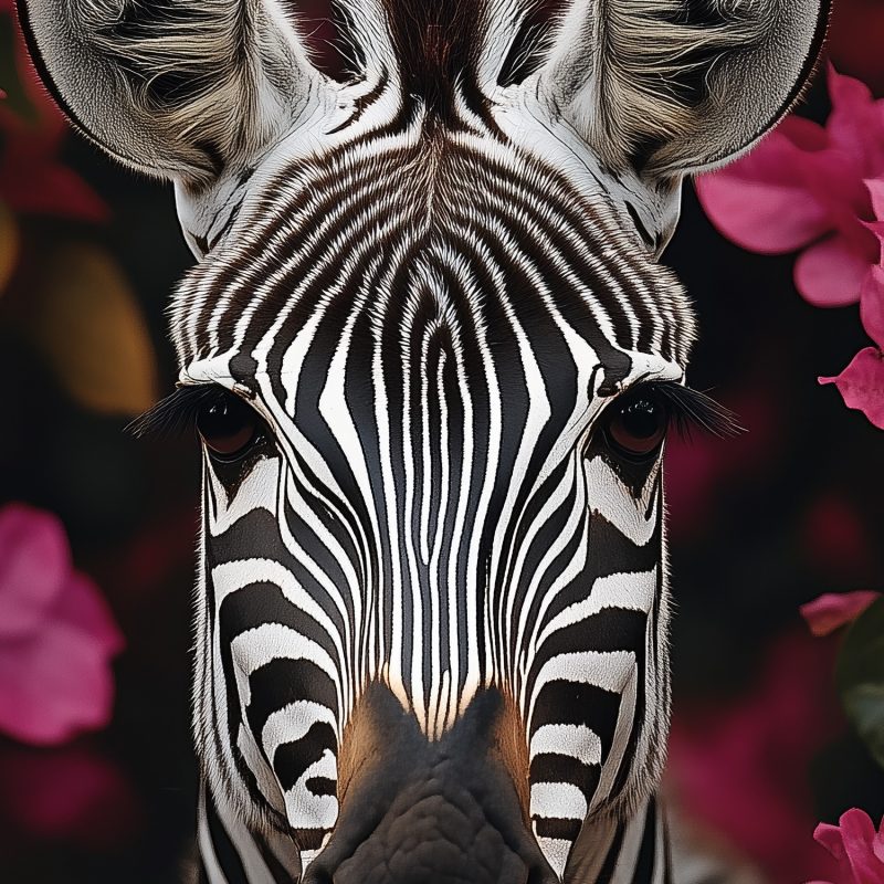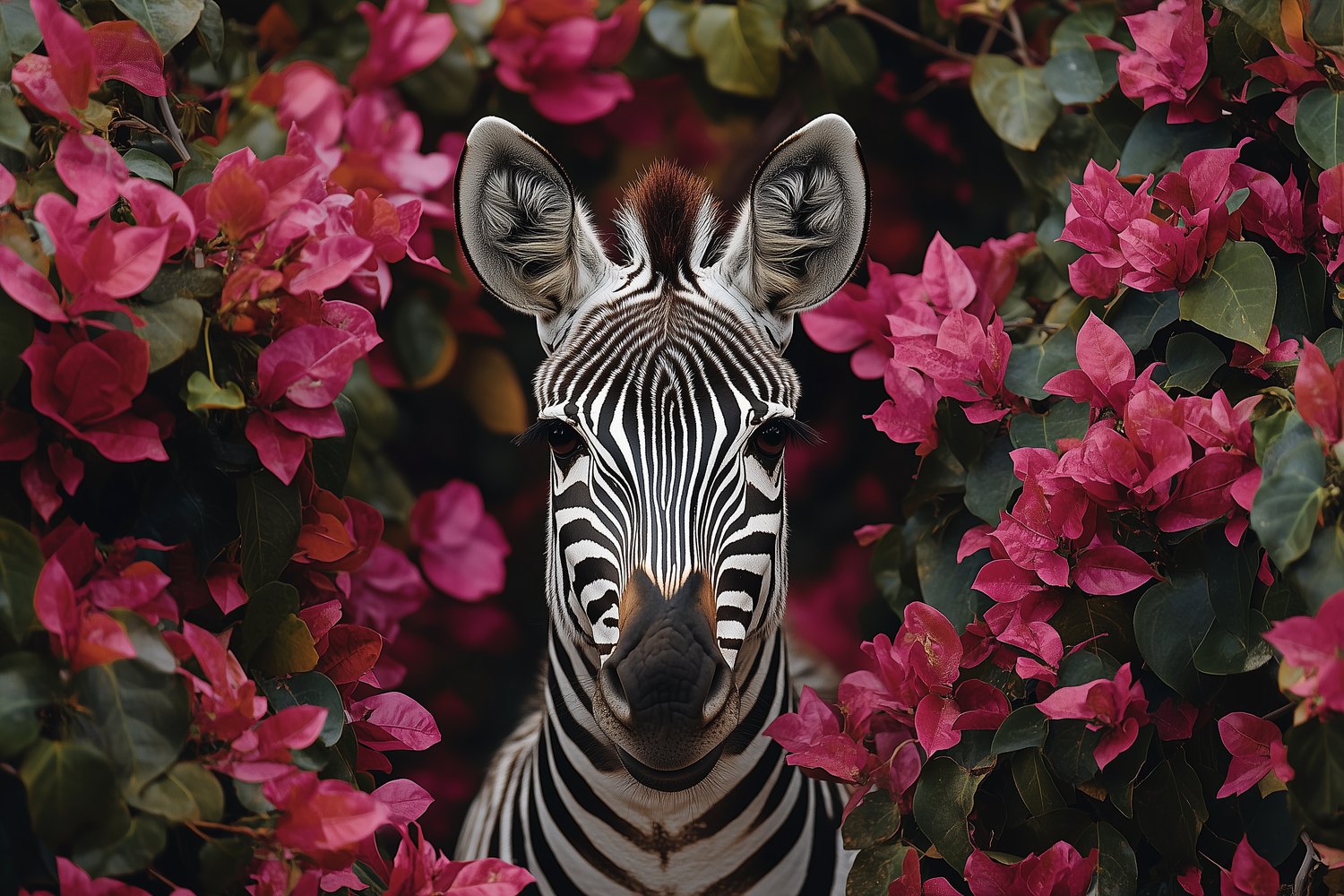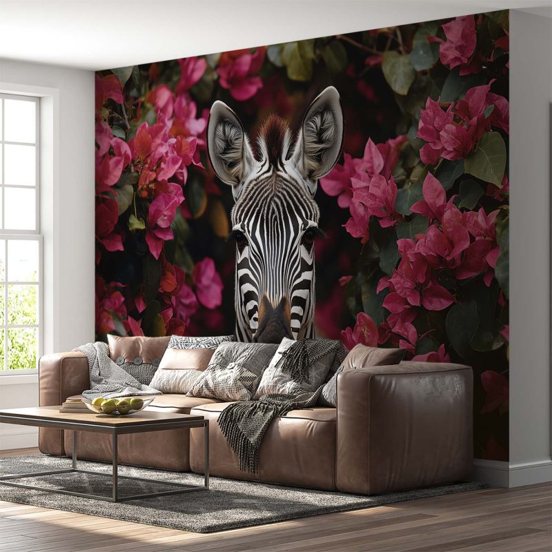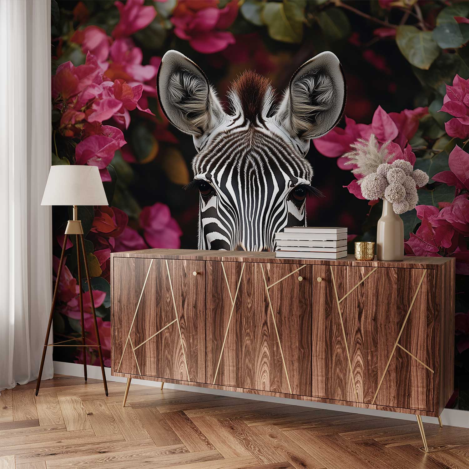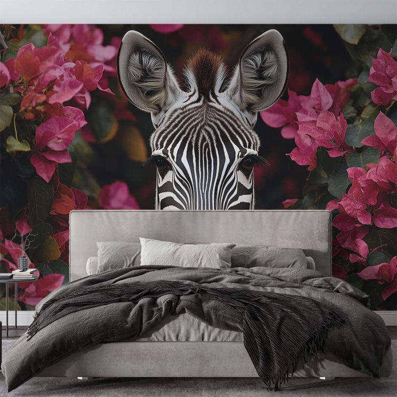 Verrast door een zebra die elegant tussen een zee van roze en rode bloemen staat. Zijn zwart witte strepen dansen met de levendige kleurenpracht. Dit behang brengt harmonie en diepte in je interieur, alsof de natuur zelf je muur tot leven wekt. Een serene sfeer die zowel rust als energie uitstraalt, perfect voor een statement muur vol natuurlijke elegantie.
