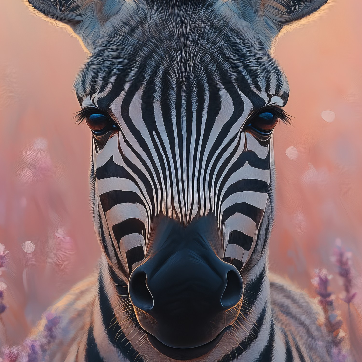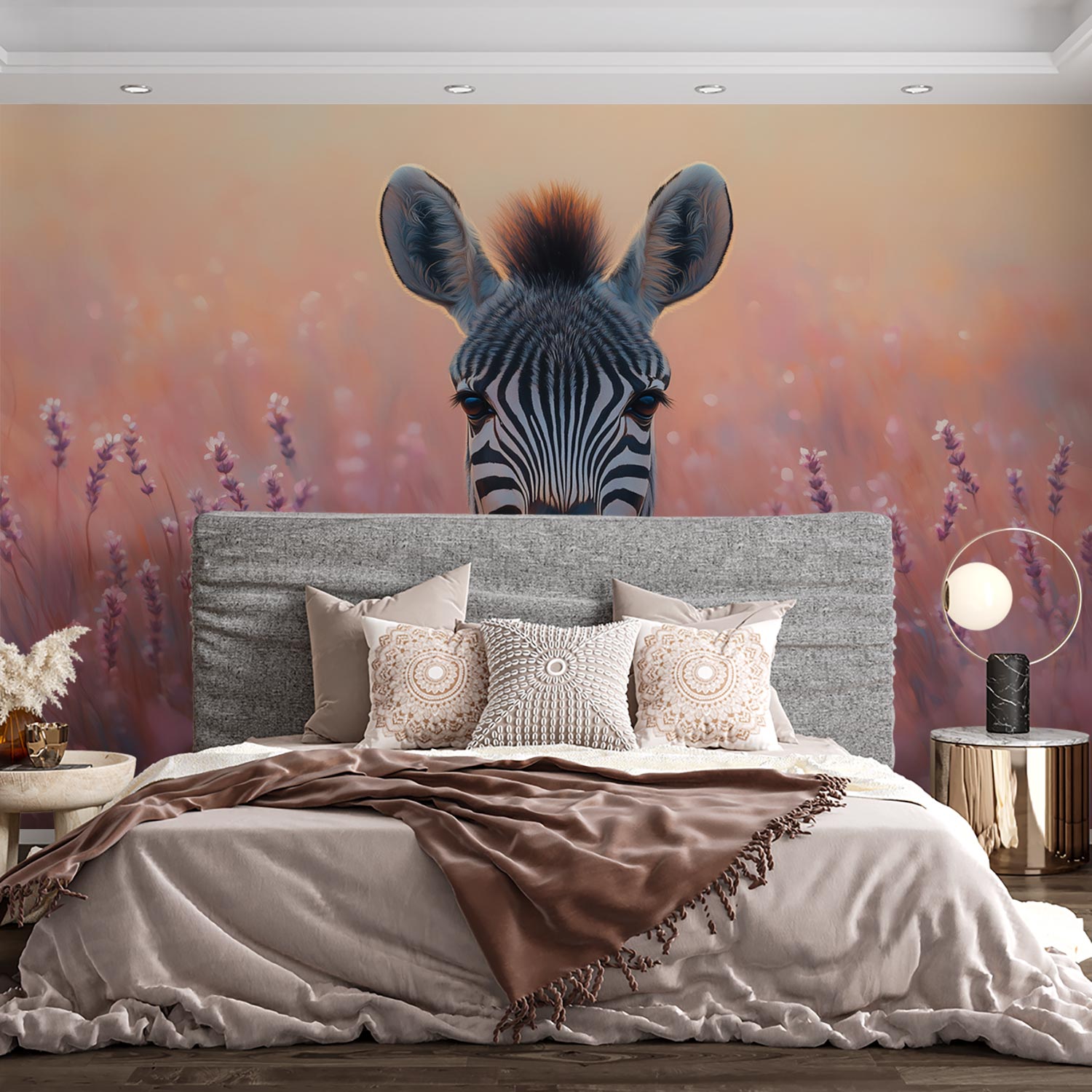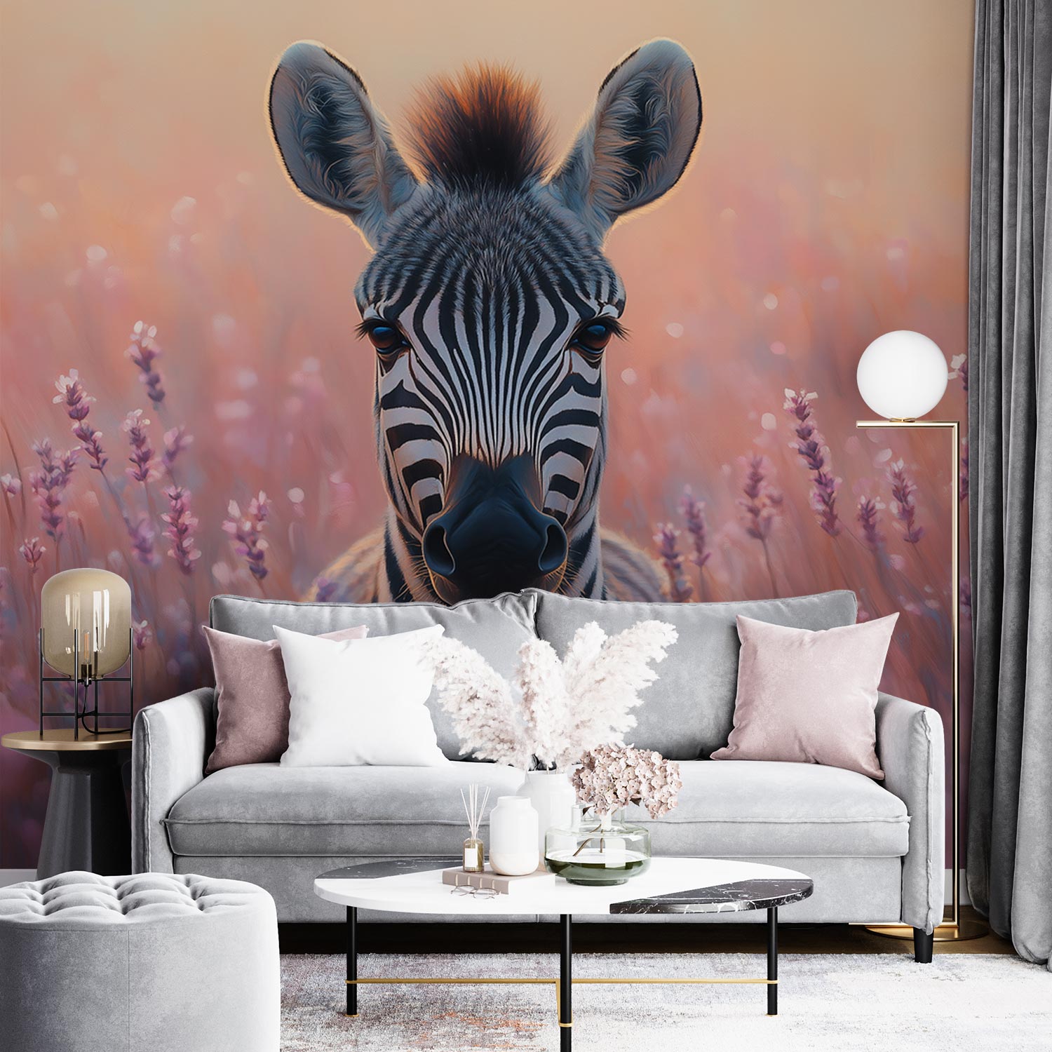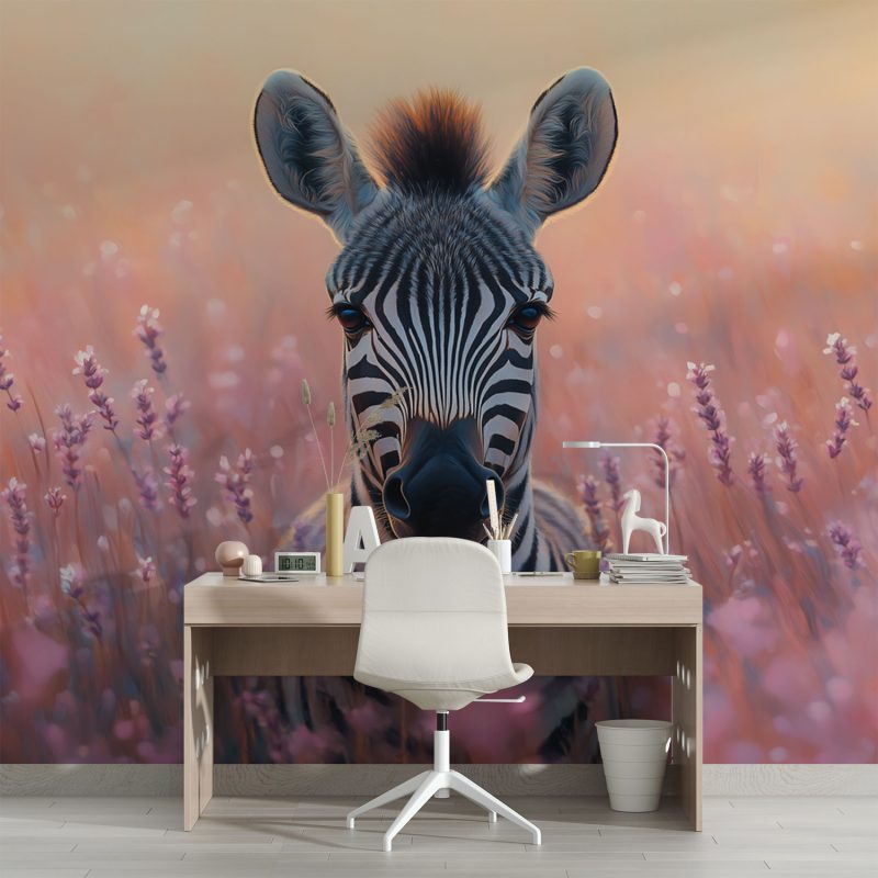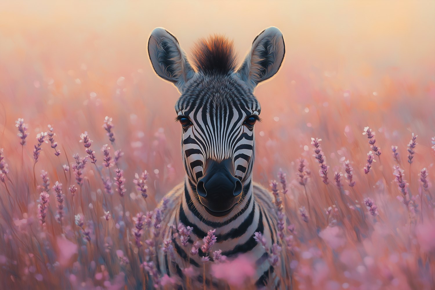 Verrast door een serene sfeer van paarse bloemenvelden. Een zebra draait zijn kop naar je toe, zijn levendige strepen dansen tussen de violette zee. Deze rustgevende scène brengt harmonie en natuur binnen, perfect om elke ruimte tot een kalme oase te transformeren.
