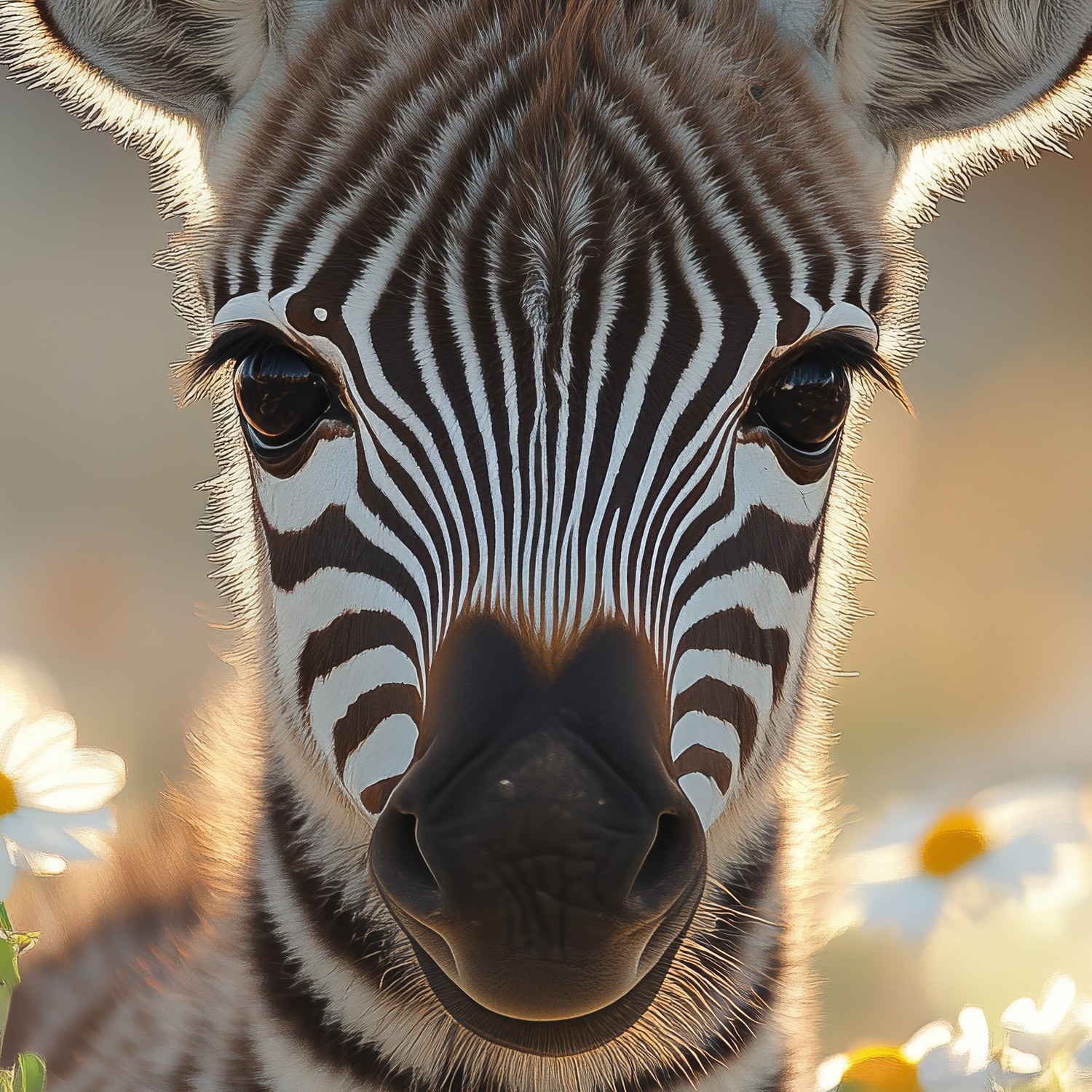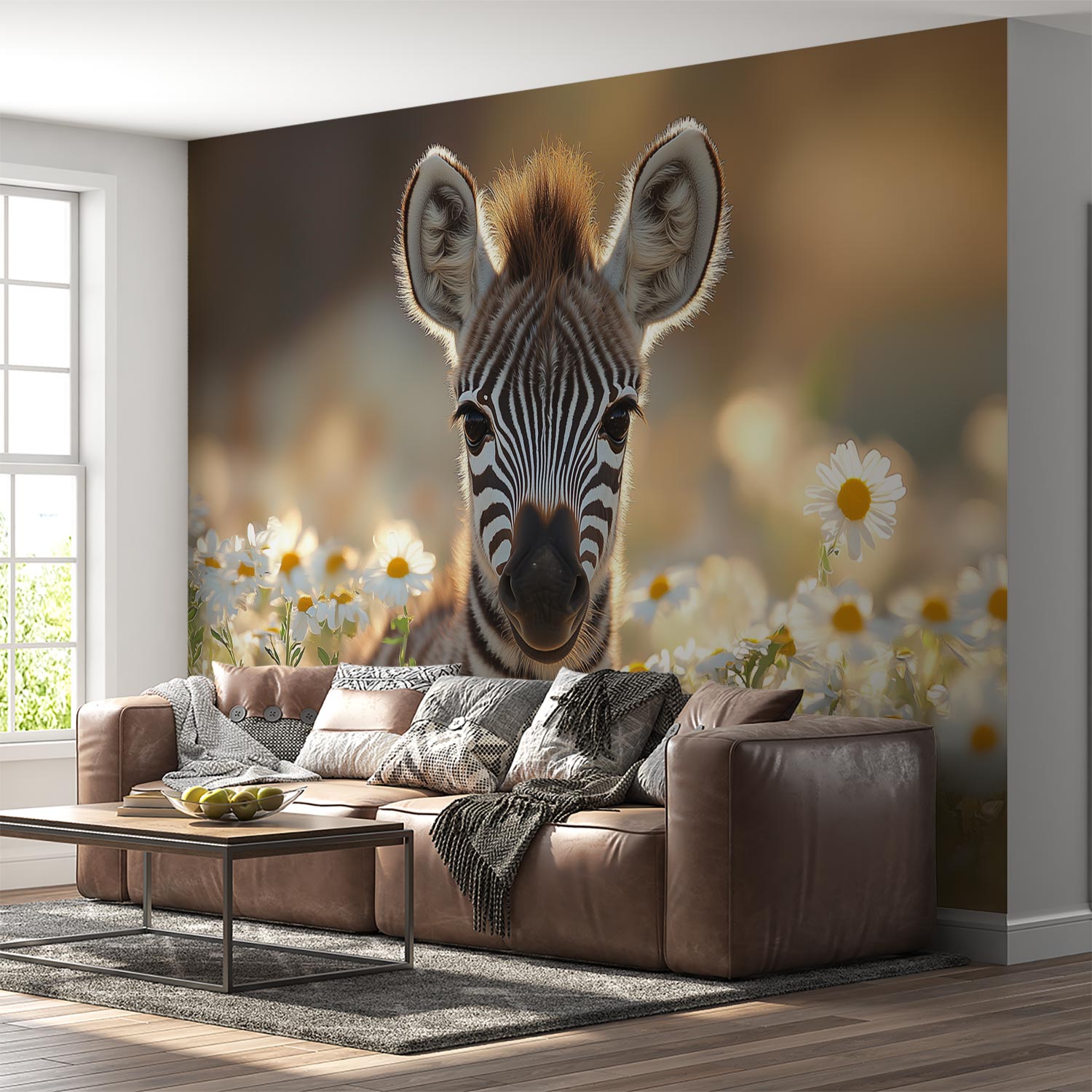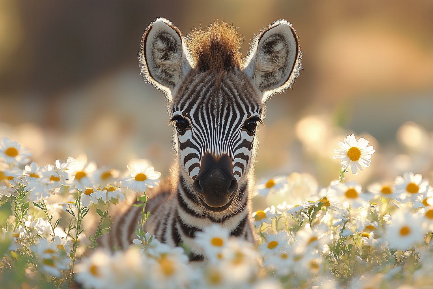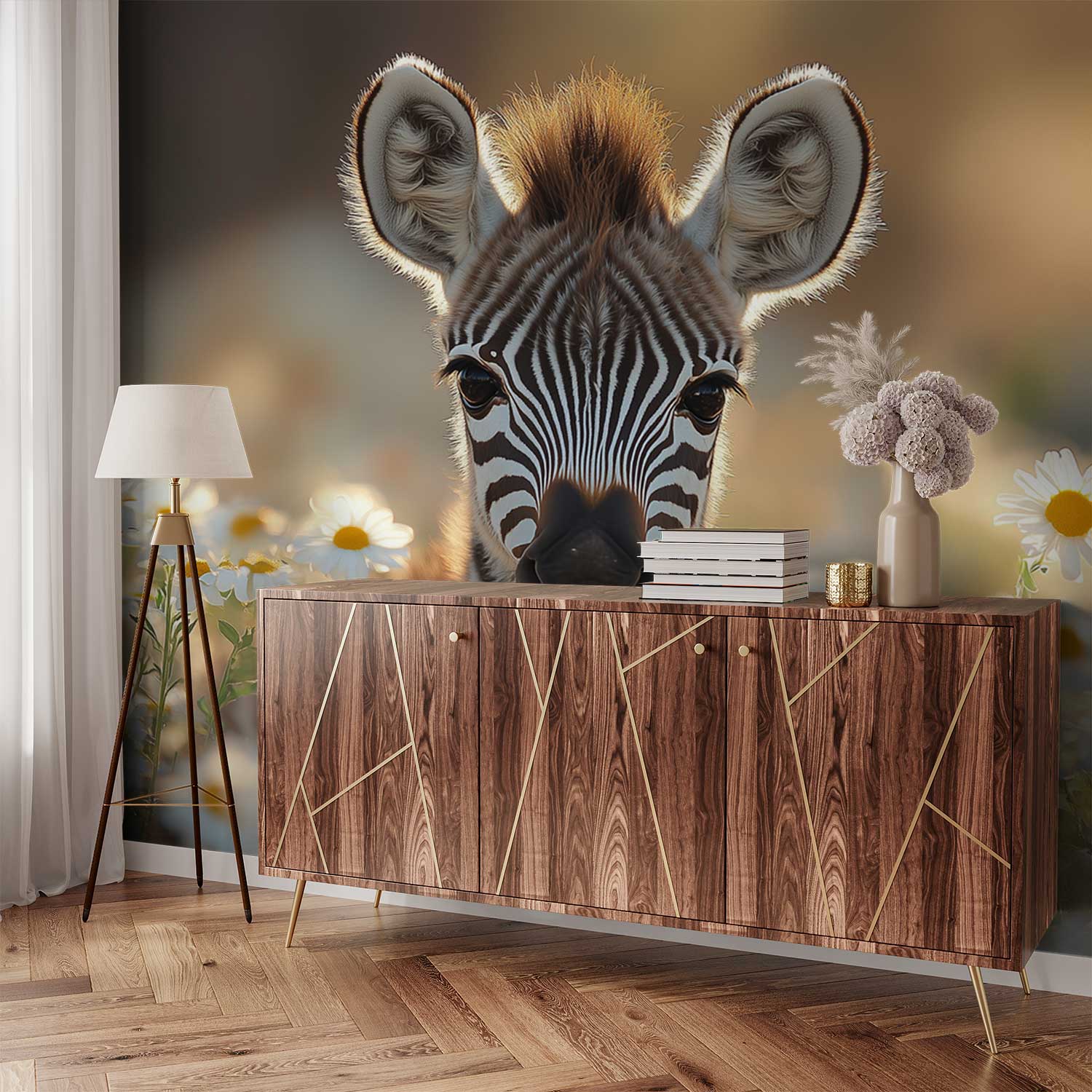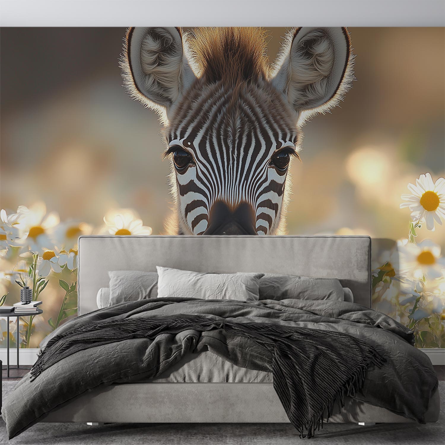 Zonnestralen baden het rustige veld in warm licht. Een jonge zebra kijkt nieuwsgierig tussen de witte madeliefjes, zijn zwartwitte strepen dansen in contrast met de tere bloemenzee. Dit levendige tafereel brengt harmonie en sereniteit in je interieur, waar de natuur haar magische moment vangt. Perfect voor wie verlangt naar een vredige ontsnapping binnen de eigen vier muren.