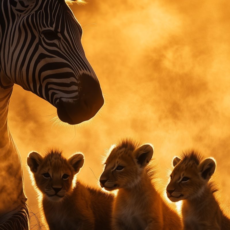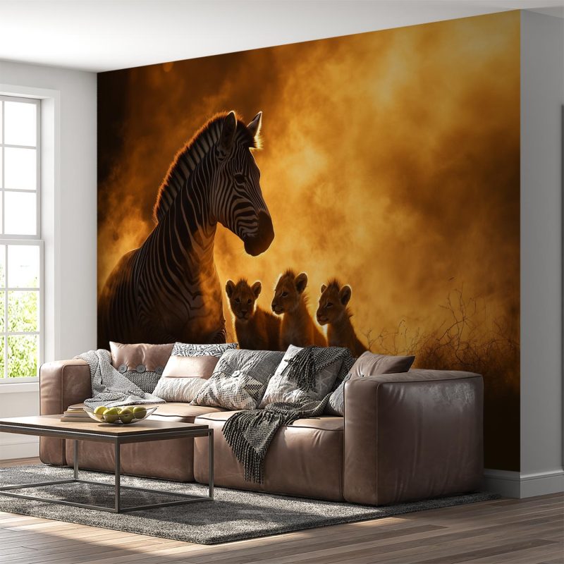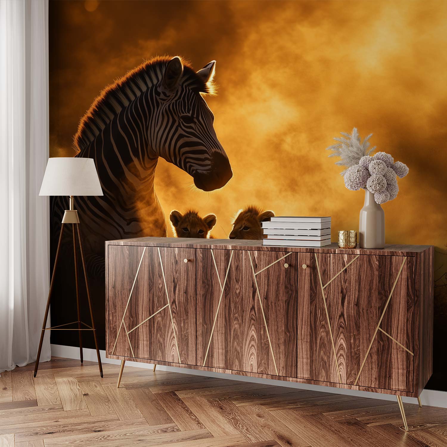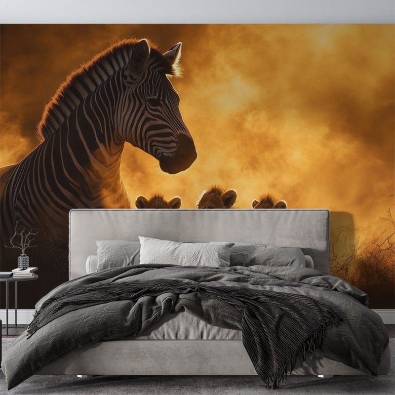 Gouden zonslicht baadt de savanne in warme oranje tinten. Links staart een zebra trots naar voren, terwijl rechts drie jonge leeuwen wegdraaien. Dit harmonieuze tafereel brengt de serene sfeer van de Afrikaanse vlaktes in huis. De levendige zwart-oranje contrasten creëren een dynamisch accent in moderne of landelijke interieurs, waar het rust en natuurlijke elegantie uitstraalt.