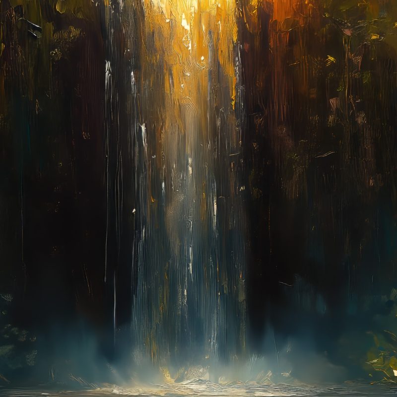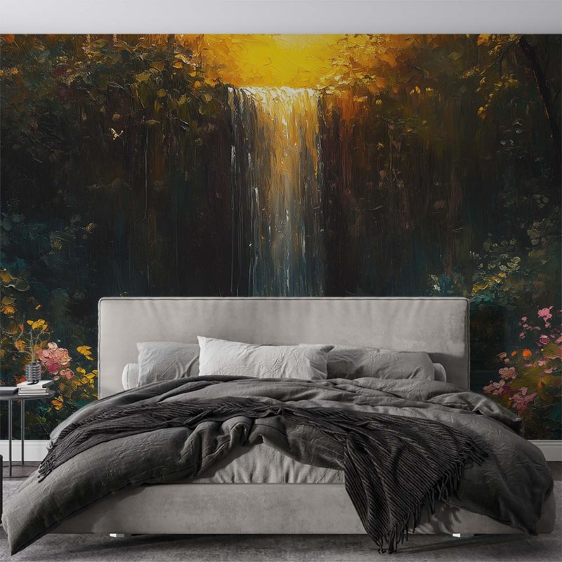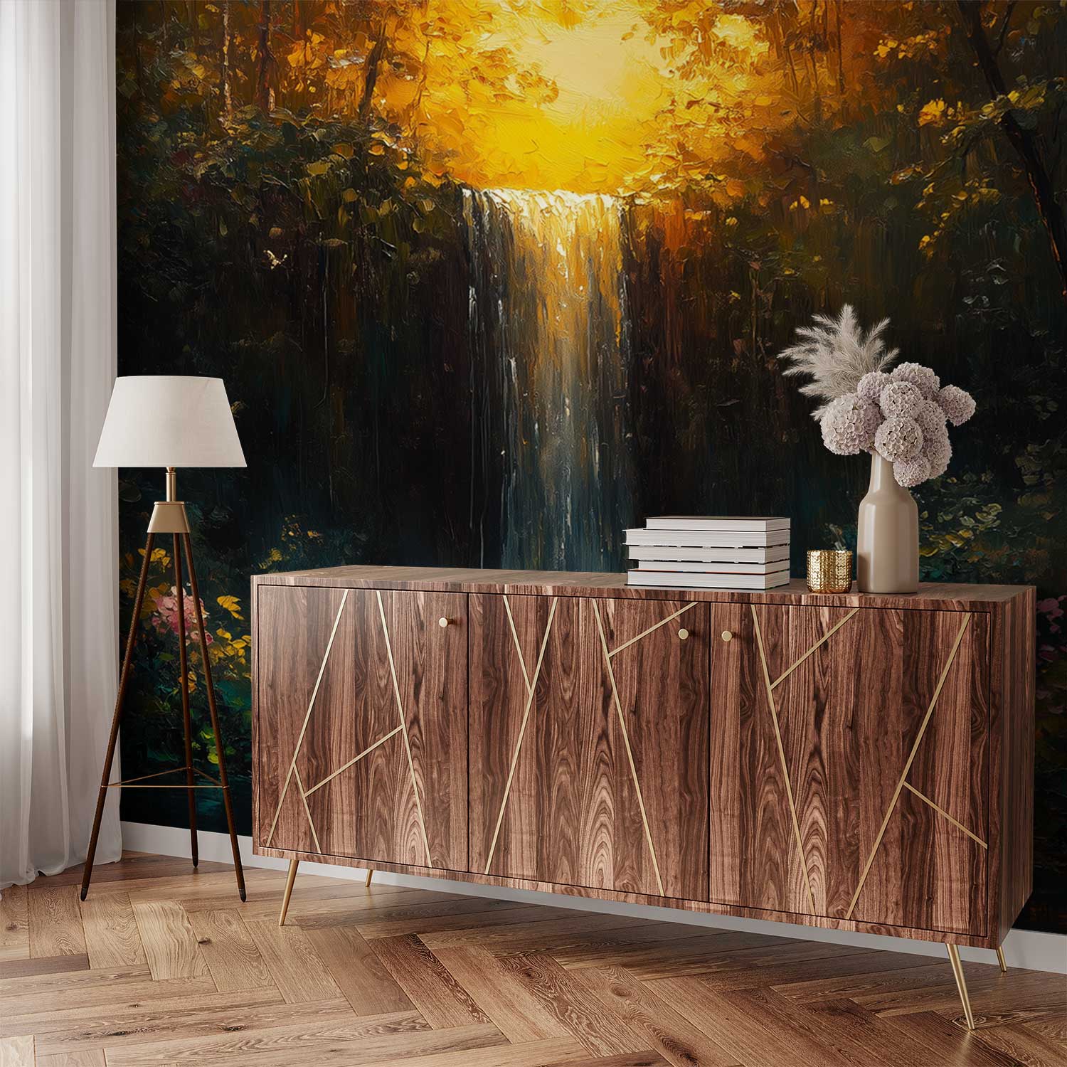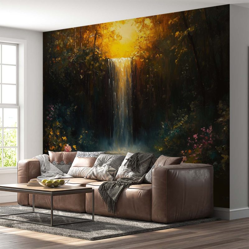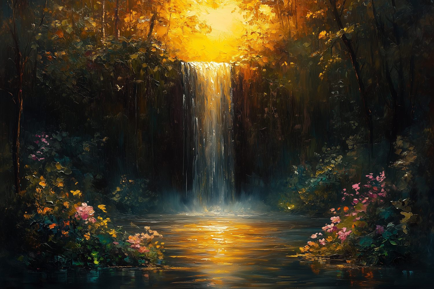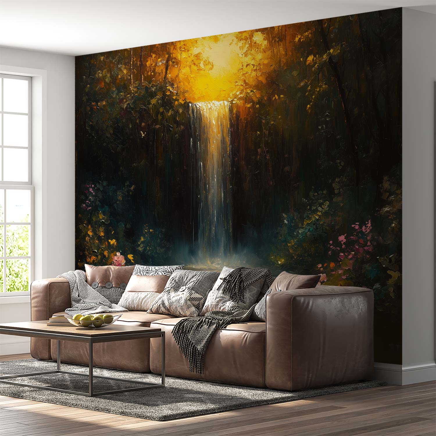 Stralend zonlicht baadt de waterval in een warme gloed, terwijl het levendige groen van het bos eromheen dansend licht vangt. Dit realistische tafereel ademt pure rust en brengt de harmonie van de natuur rechtstreeks jouw ruimte in. Perfect voor wie verlangt naar een serene ontsnapping binnen de eigen vier muren.
