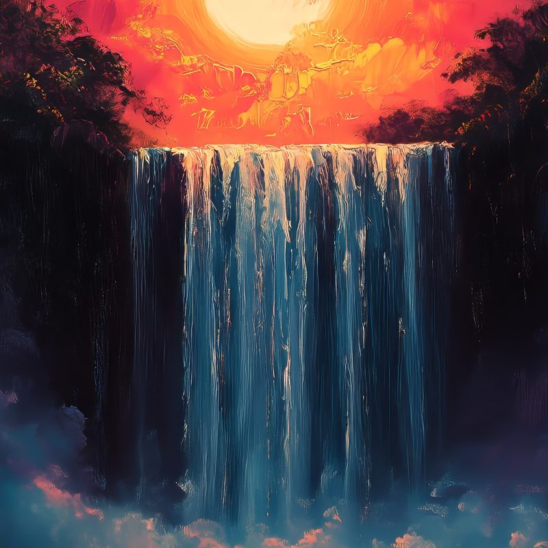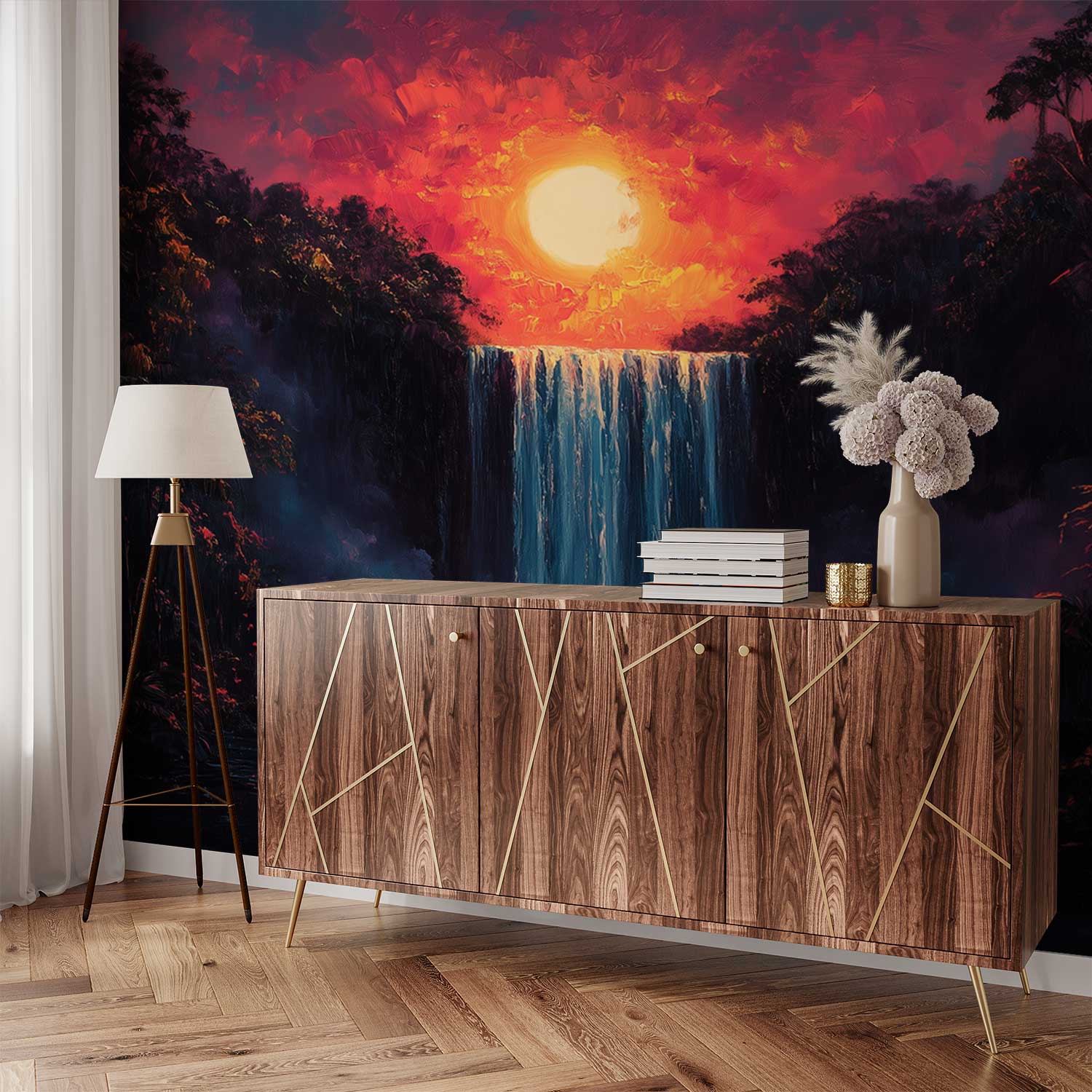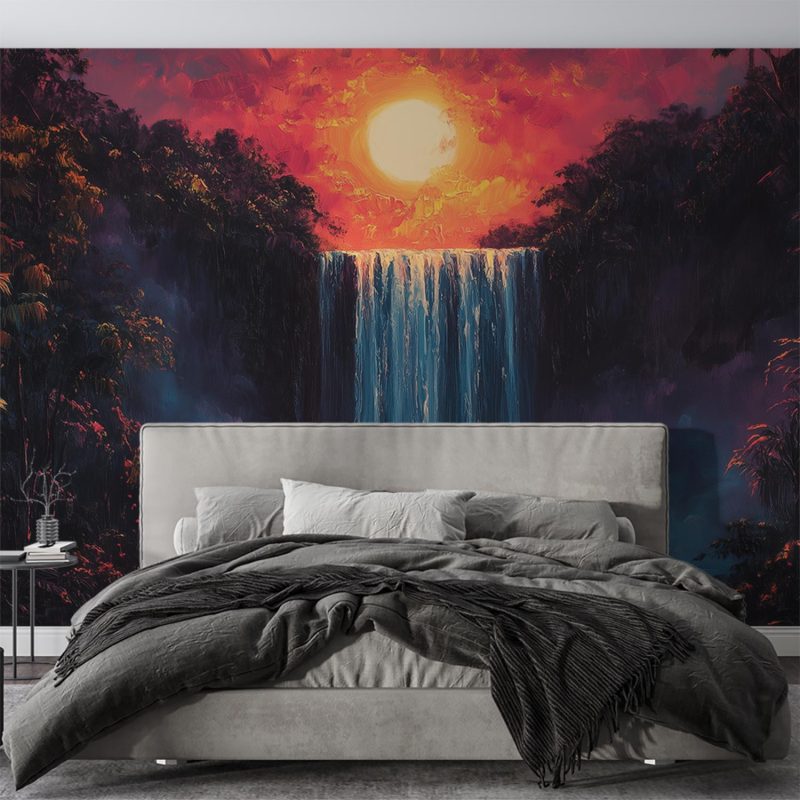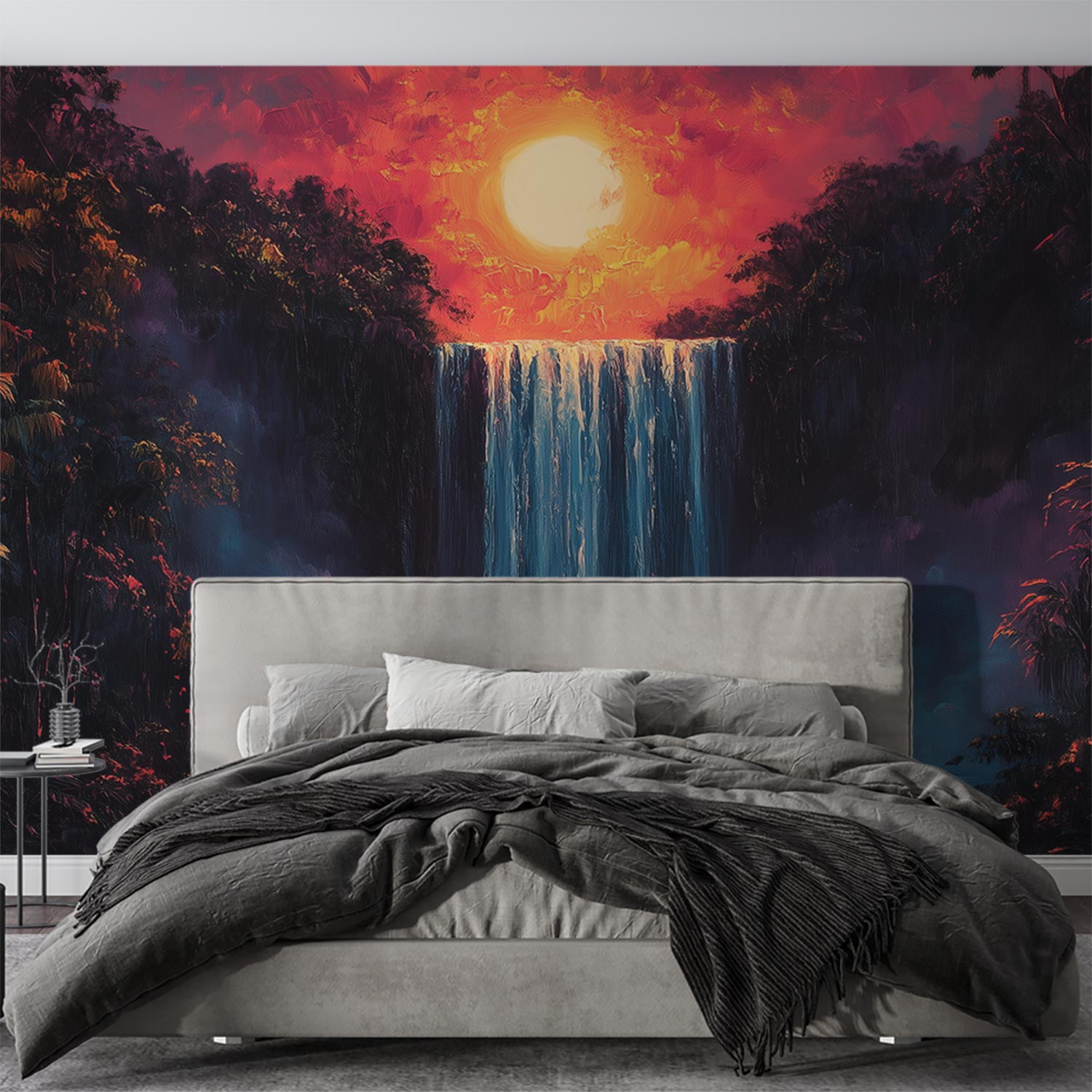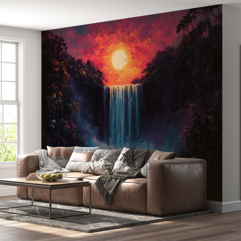 Zachte watervalstromen glijden langs de rotsen, omhuld door een warme gloed van oranje en rood. Levendige blauwe accenten dansen tussen het weelderige groen, vol energie en rust. Dit behang brengt de harmonieuze kracht van de natuur naar binnen, creëert een serene sfeer en transformeert elke ruimte in een oase van natuurlijke schoonheid.