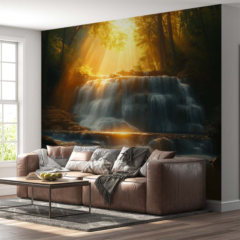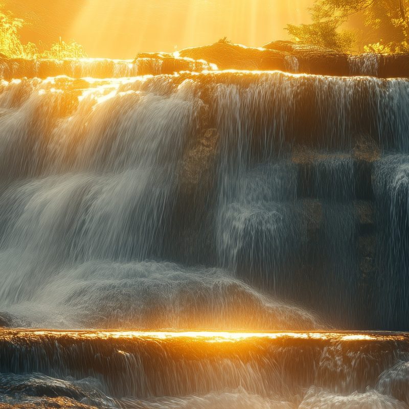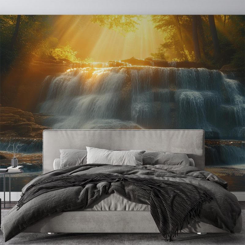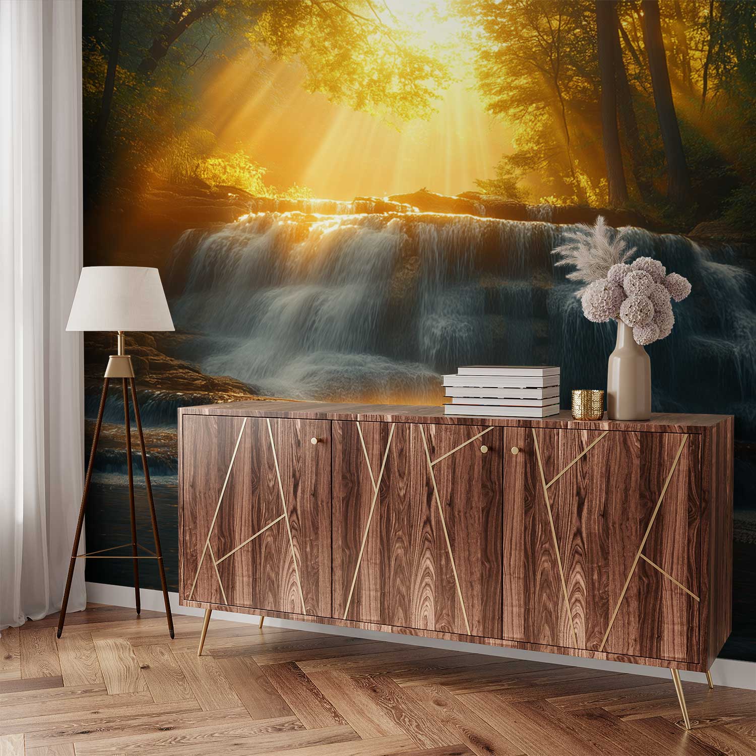 Zachte zonnestralen dansen over het kabbelende water, omarmd door weelderig groen en aardse tinten. Dit levendige watervaltafereel brengt de rustgevende energie van de natuur naar binnen, creëert een oase van kalmte in je interieur. De harmonieuze compositie met het spel van licht en reflectie voelt als een adem van frisse lucht in je ruimte.
