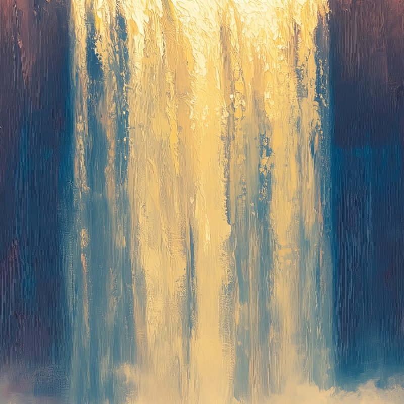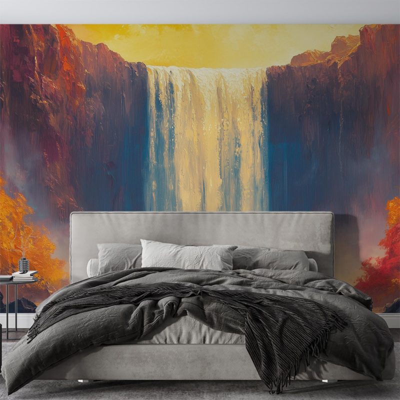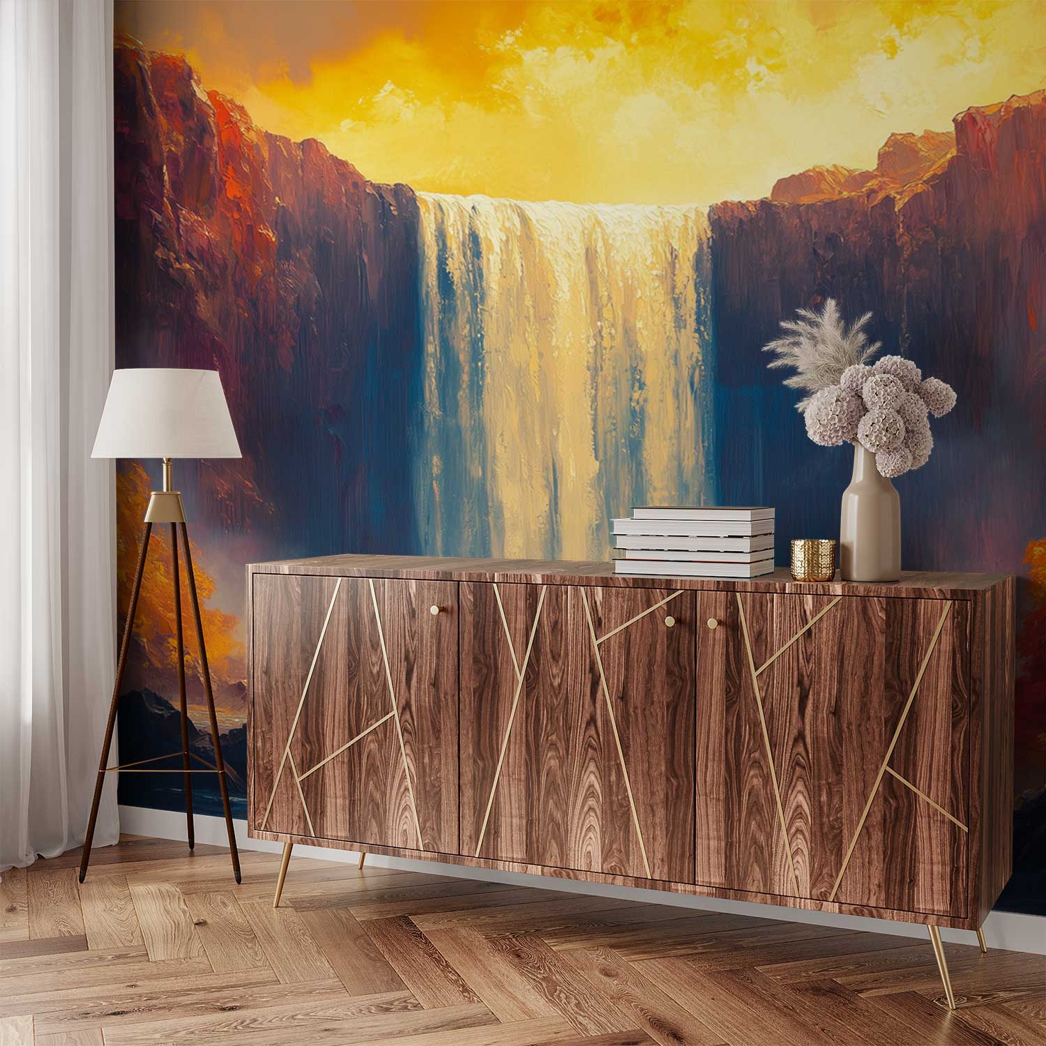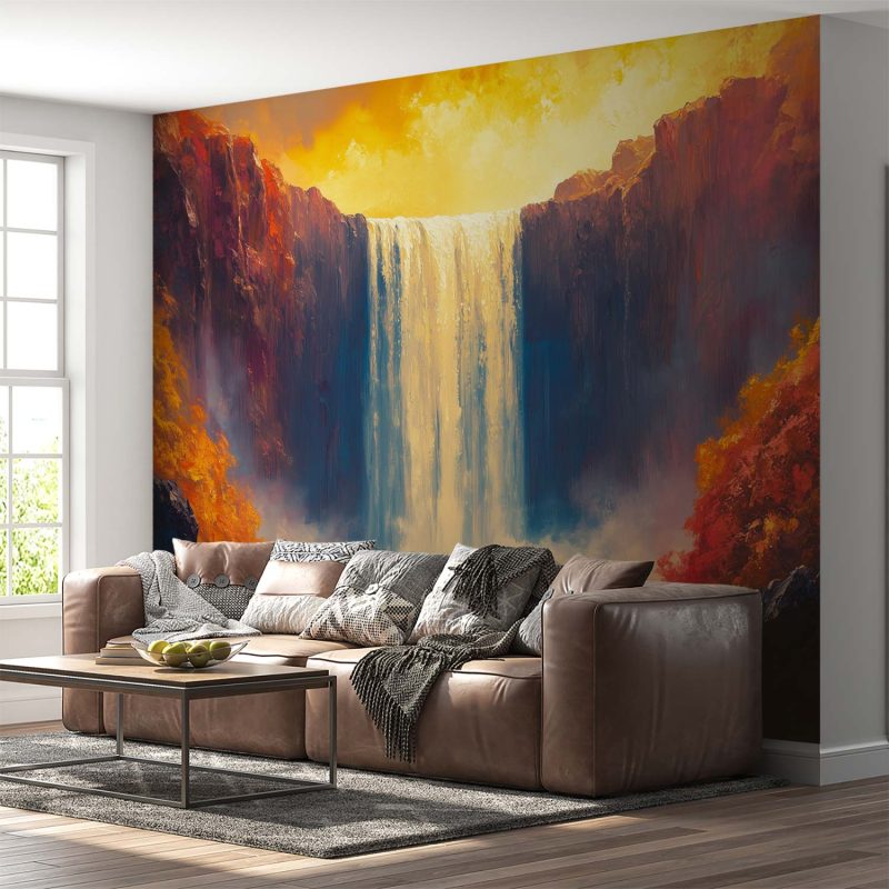 Zachte oranje en gele tinten omarmen een krachtige waterval die levenskracht uitstraalt. Tussen de flankerende rotsen danst het water naar beneden, badend in een warme zonnestraling. Deze levendige scène brengt rust en harmonie in je ruimte, als een natuurlijk kunstwerk dat elke muur transformeert tot een serene blikvanger vol positieve energie.