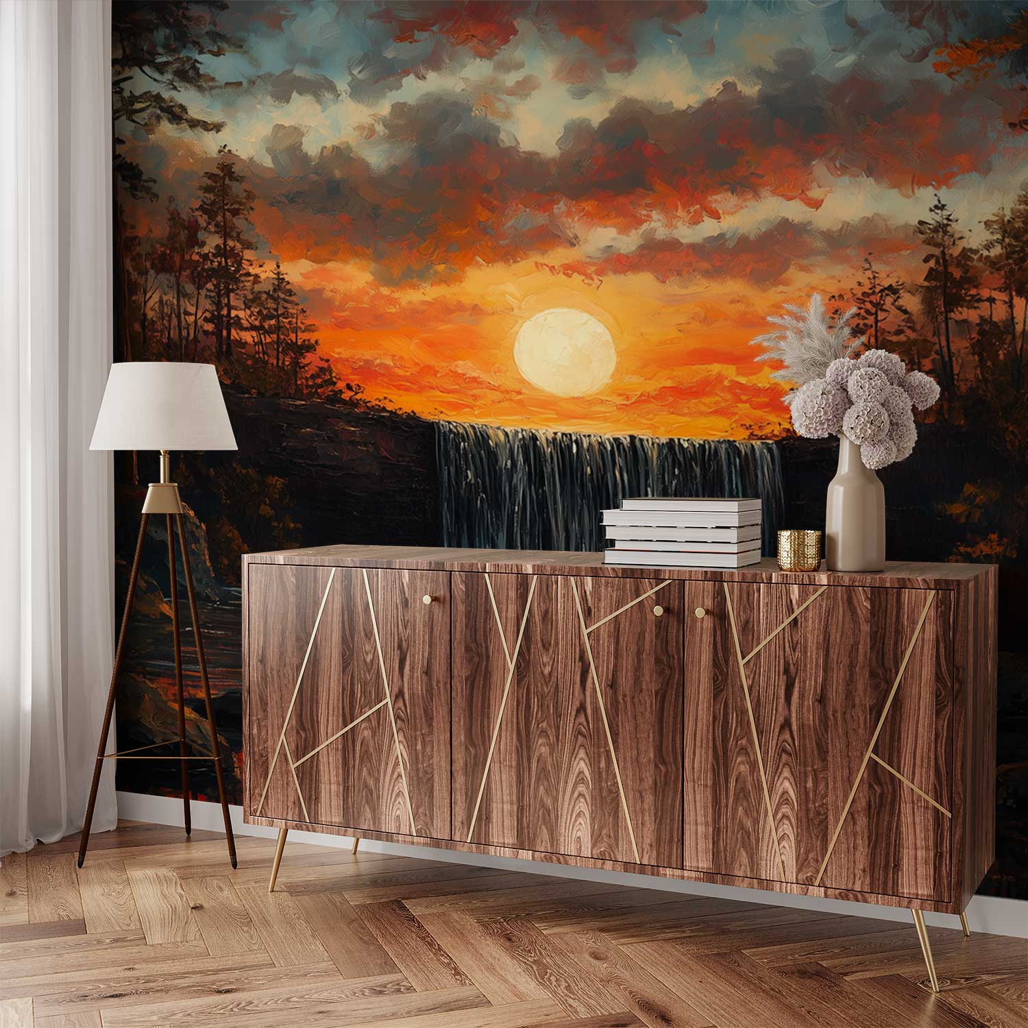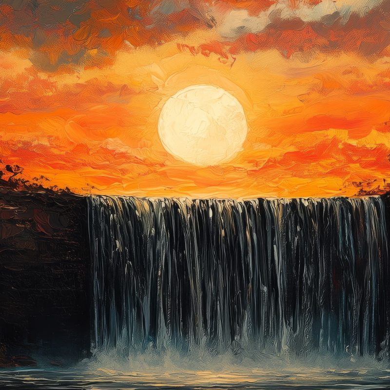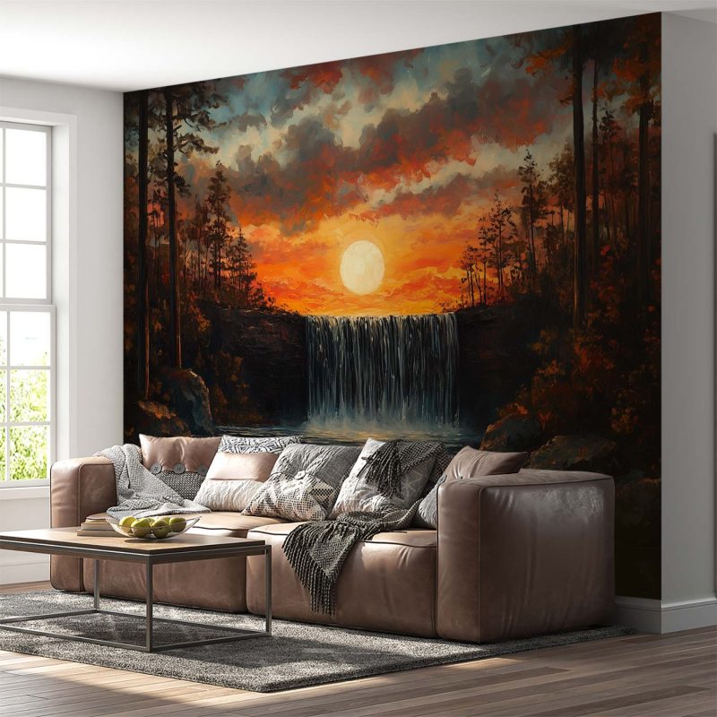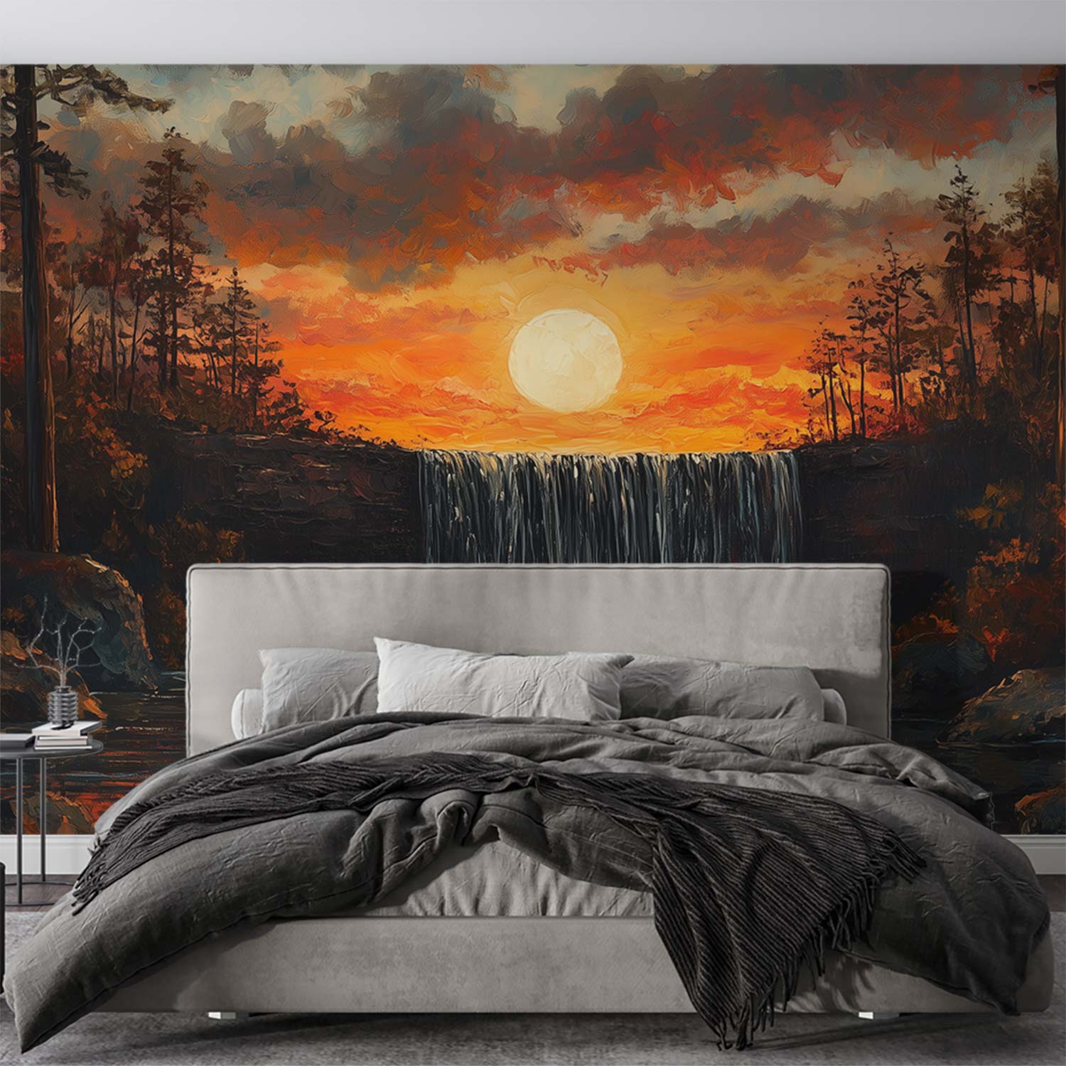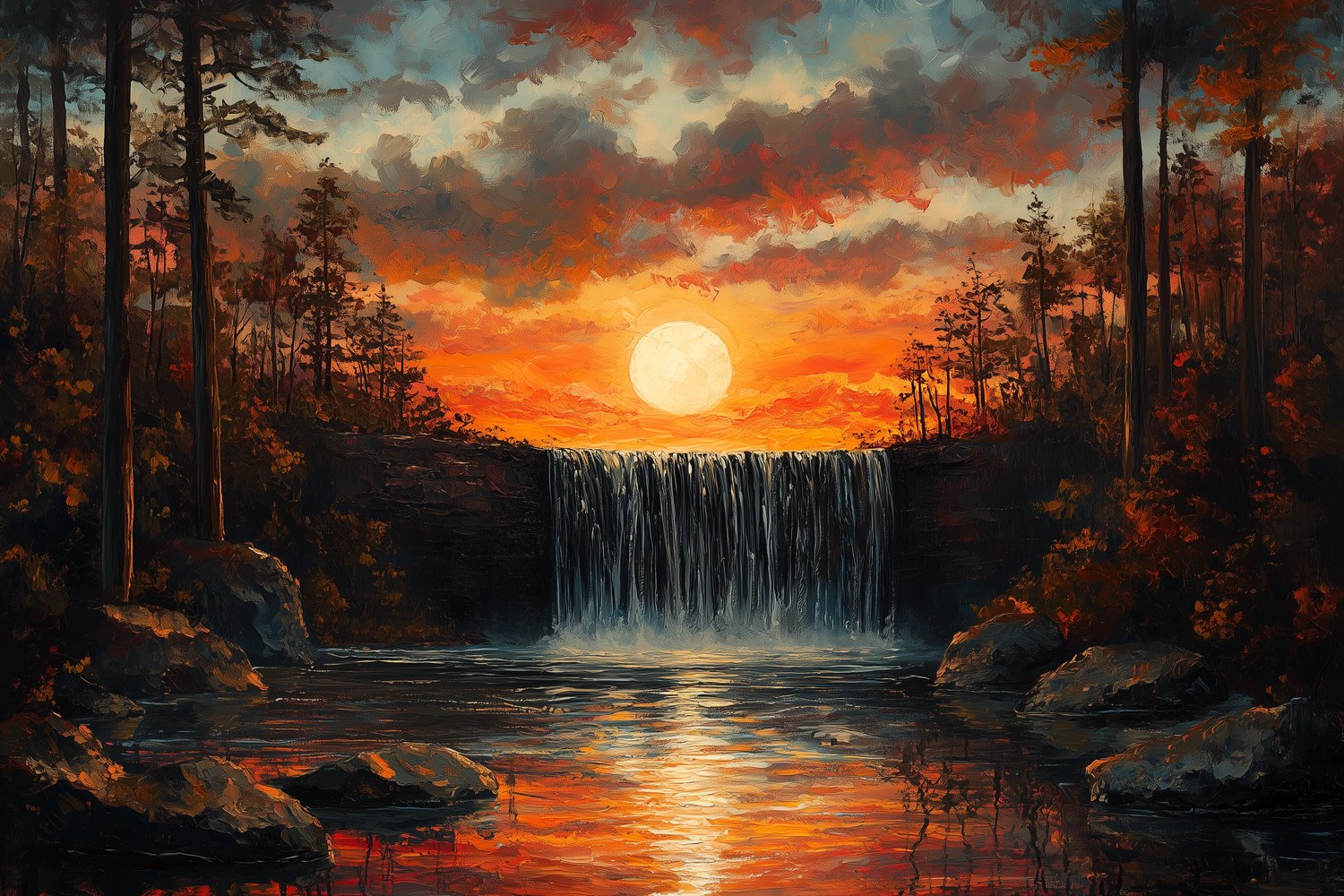 Vurige oranje en rode tinten dansen over het doek, waar een waterval levendig in het meer stort. Deze impressionistische scène ademt de warmte van een ondergaande zon en weerspiegelt een gevoel van diepe rust. Perfect om elke ruimte te transformeren tot een oase van serene natuurlijke schoonheid, vol passie en verstilling.