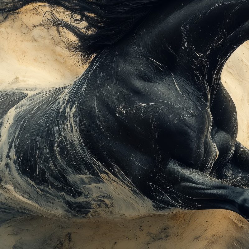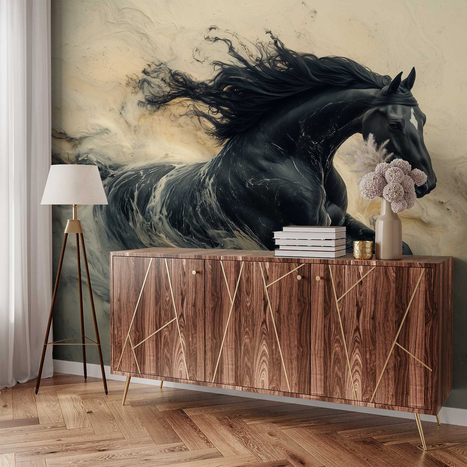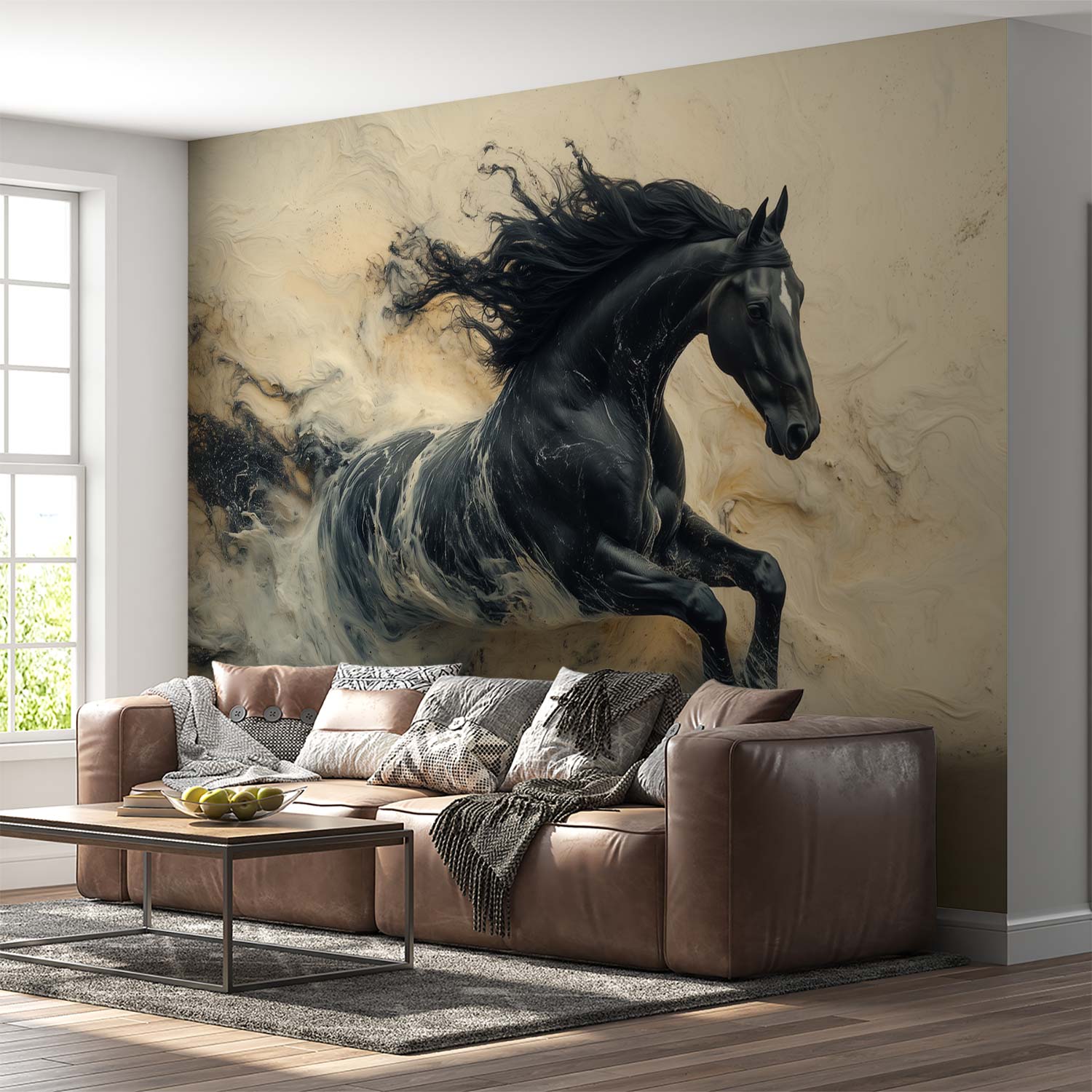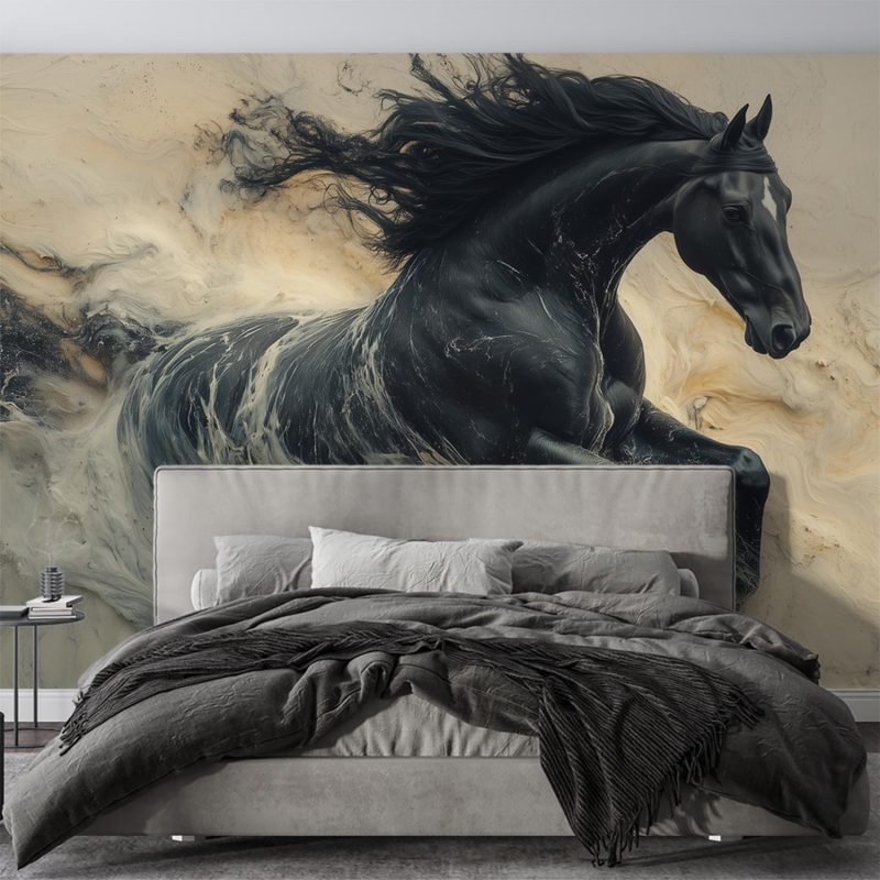 Vrijheid en kracht vangen in één beeld. Dit zwarte paard galoppeert dynamisch met wapperende manen tegen een beige achtergrond. De beweging en het contrast creëren een levendige sfeer van elegantie. Perfect voor een statement muur die energie en diepte toevoegt aan je ruimte.
