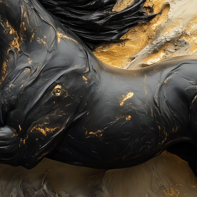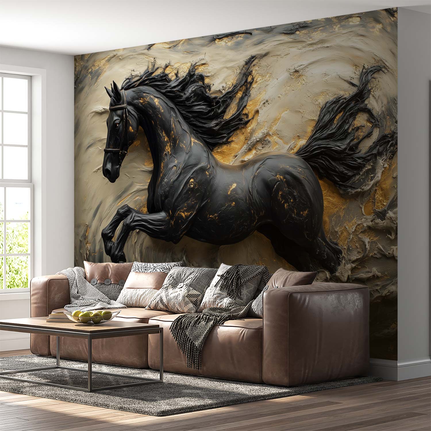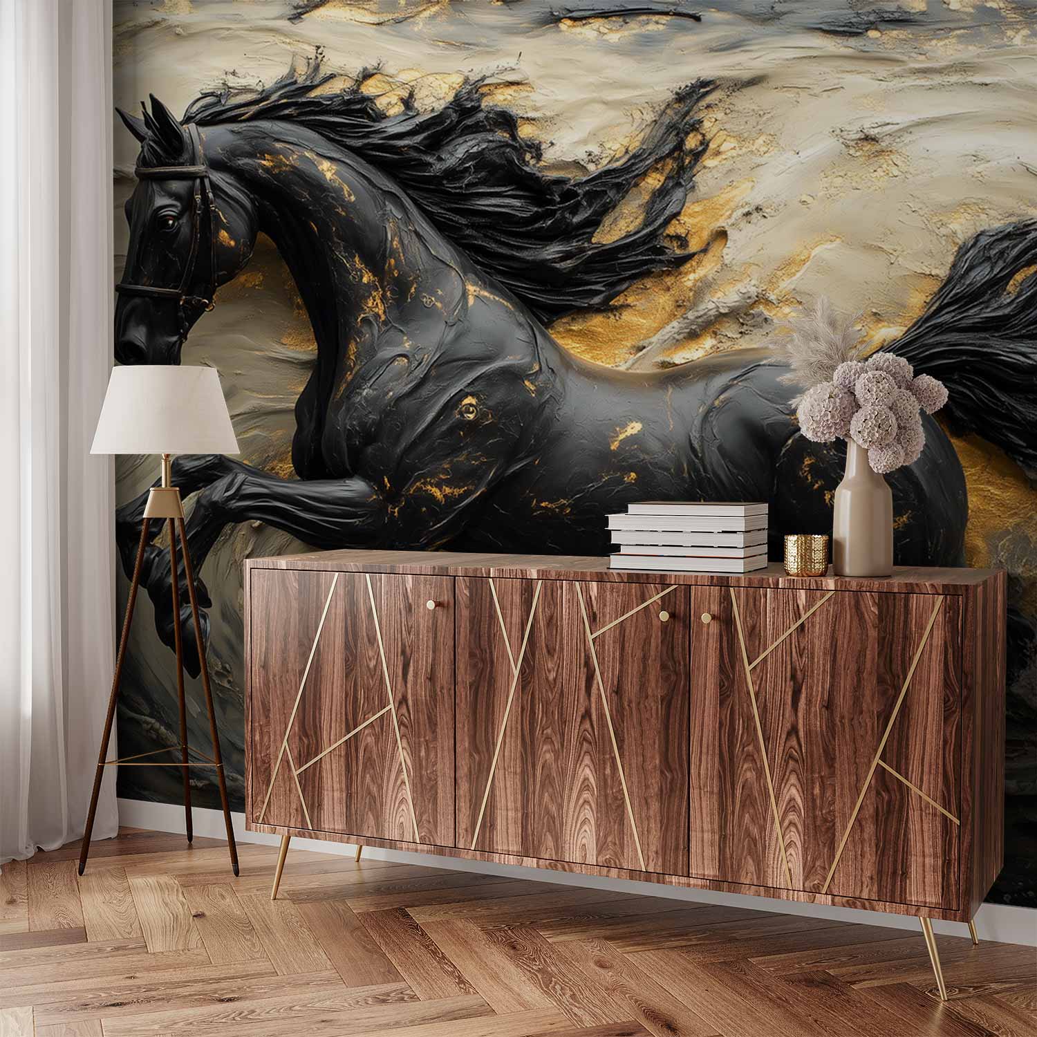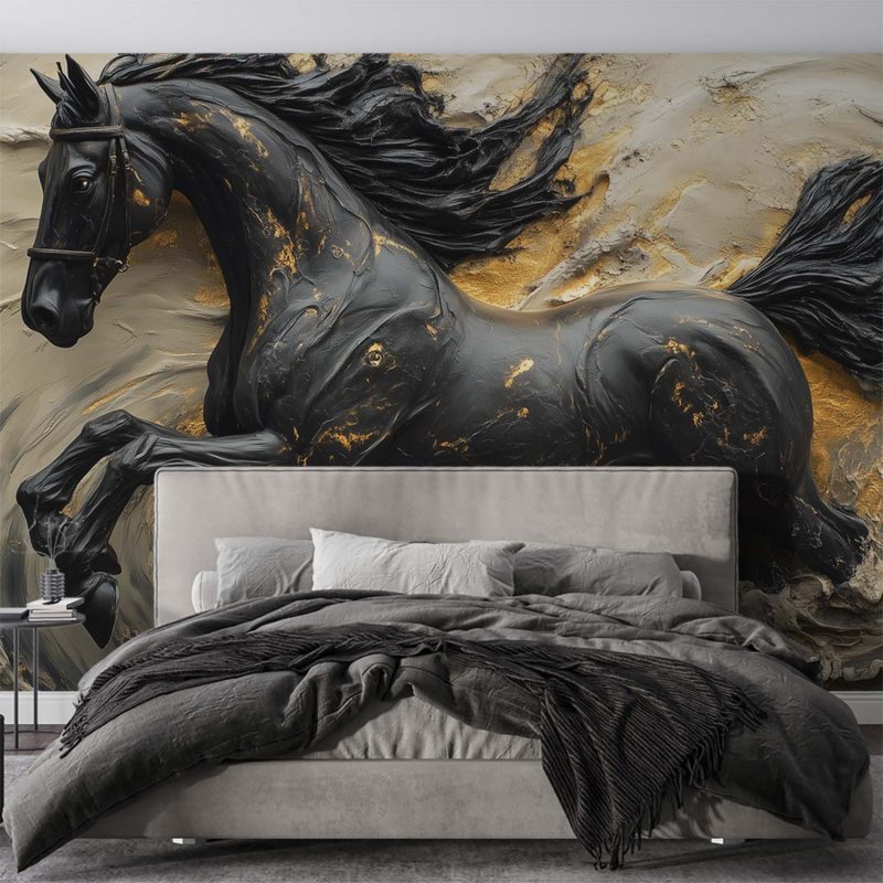 Krachtig galoppeert dit zwarte paard met gouden accenten over golvende lijnen. Zijn dynamische houding straalt pure energie en elegantie uit. De wazige achtergrond laat alle aandacht naar dit majestueuze kunstwerk gaan. Dit behang brengt beweging en verfijning in je interieur, perfect voor wie durft te kiezen voor een statement vol karakter en tijdloze stijl.