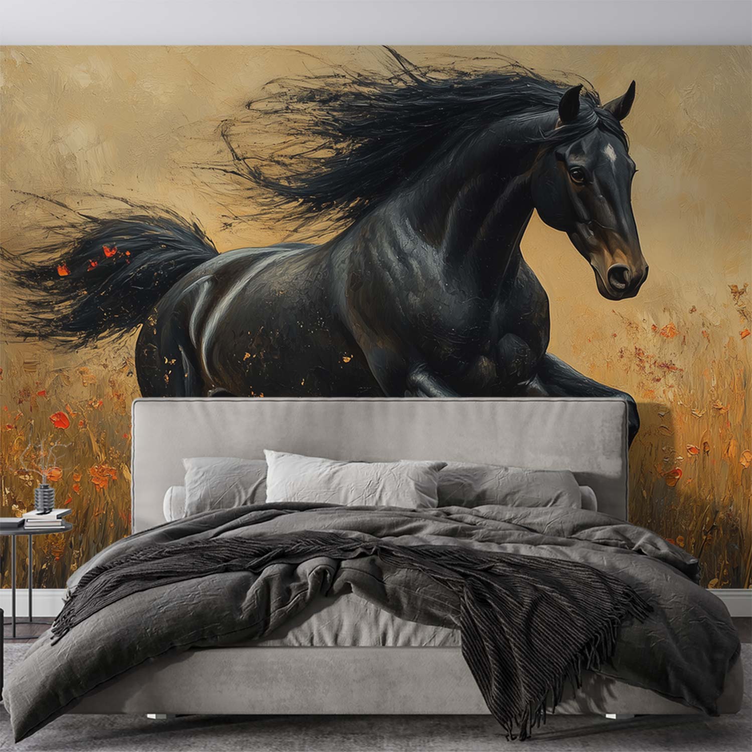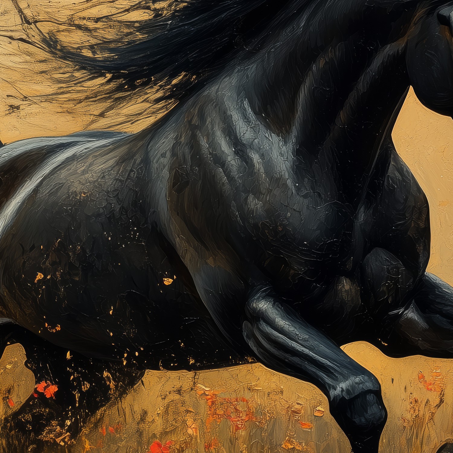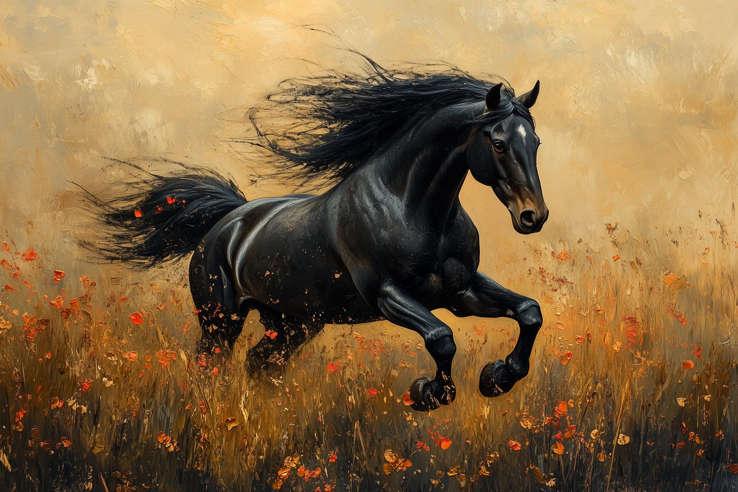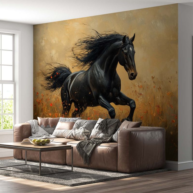 Vlugge zwarte schim galoppeert door een zee van bloemen, zijn wapperende manen vangen alle aandacht. Levendige energie spat van dit realistische tafereel, waar elke penseelstreek beweging en kracht uitstraalt. Brengt dynamiek en natuurlijke elegantie in je ruimte, perfect voor een statement muur die je interieur tot leven wekt.
