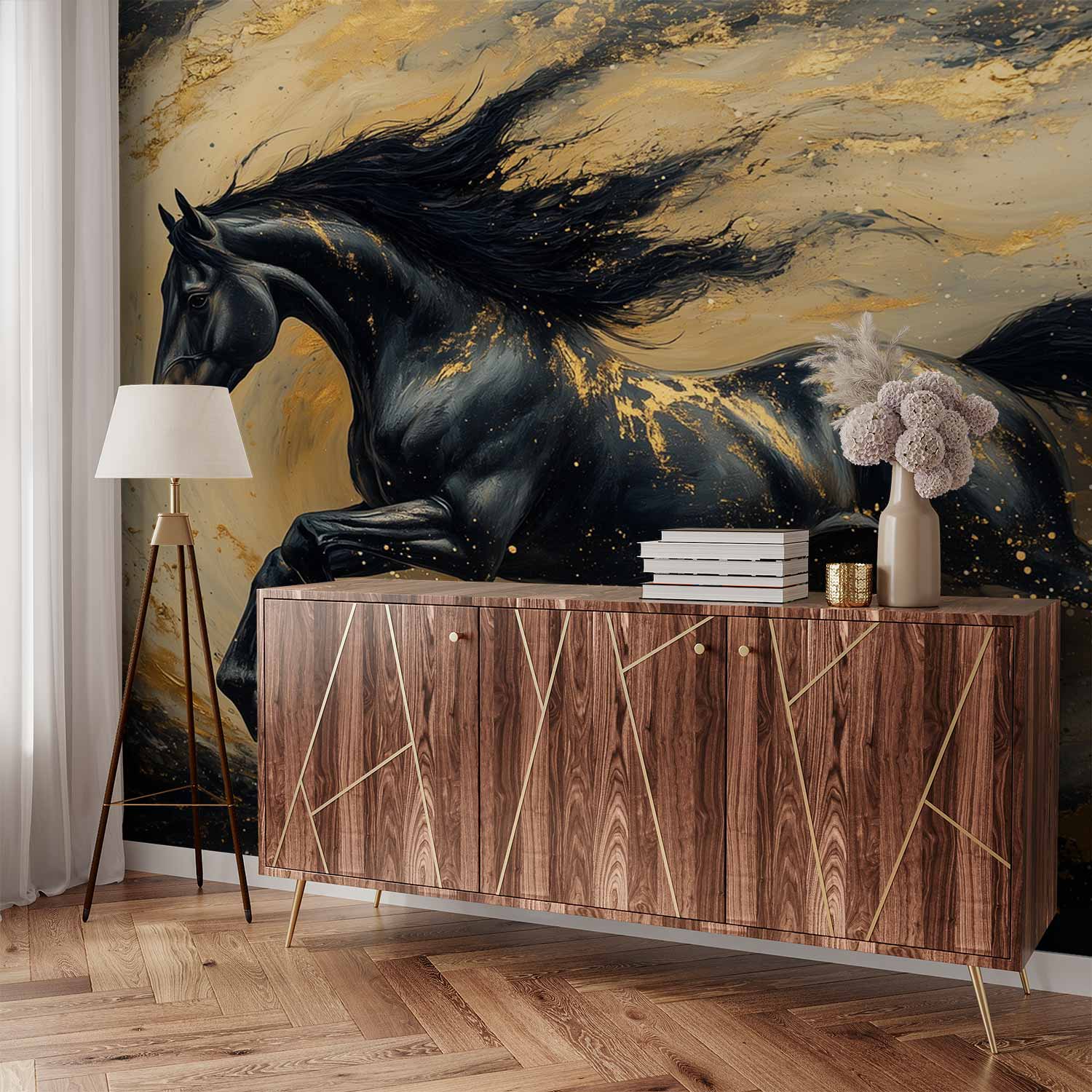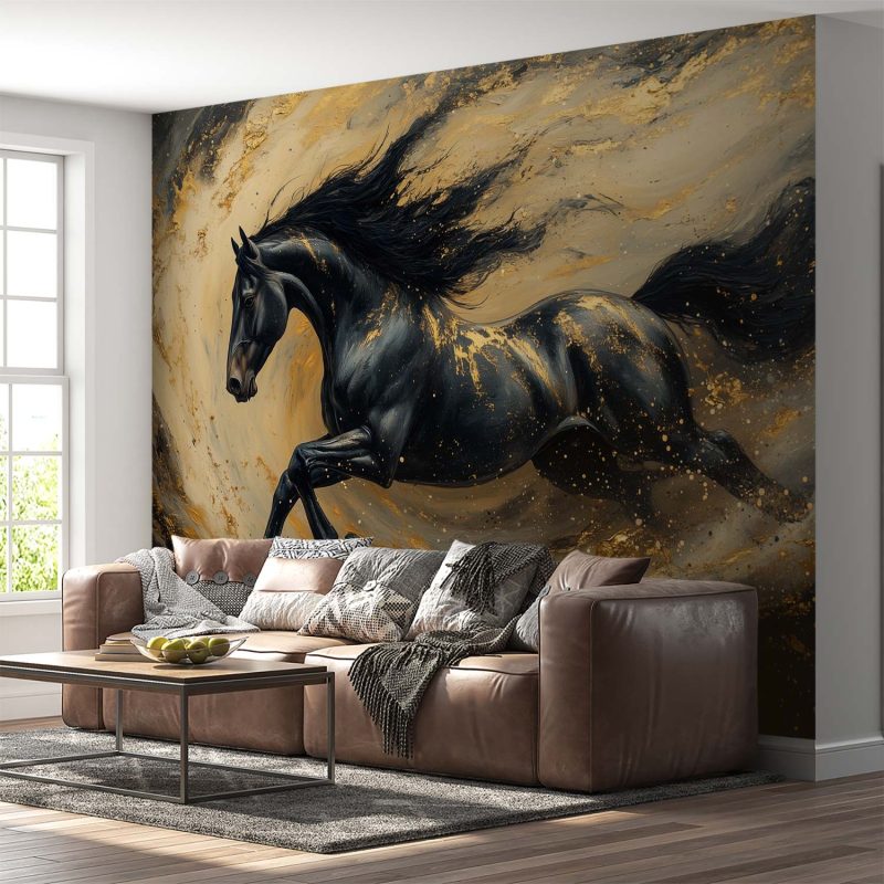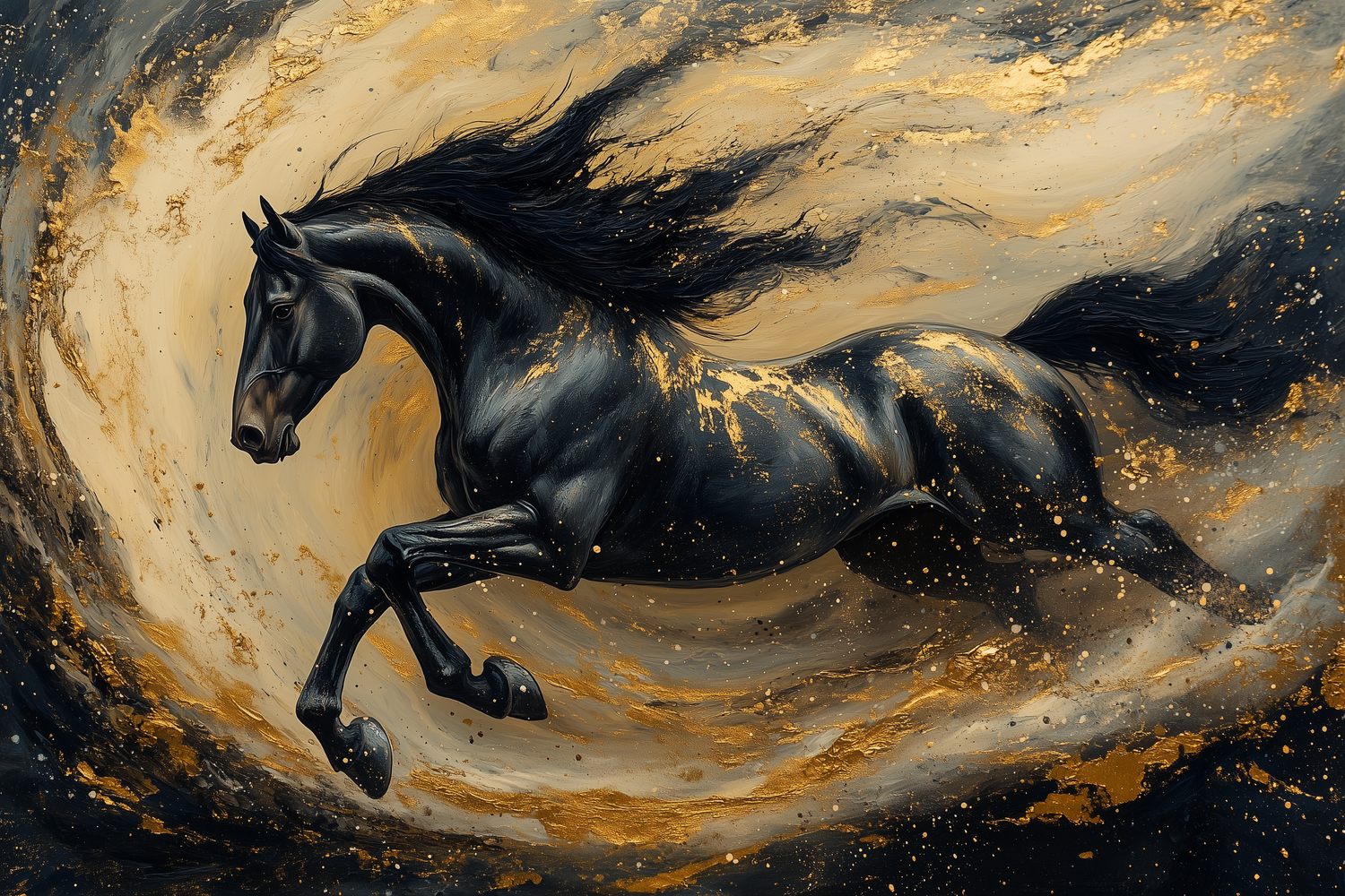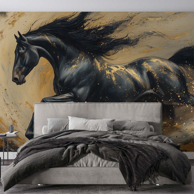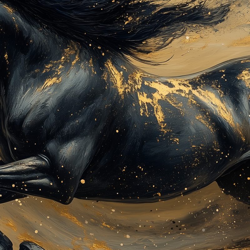 Vloeiend goud en zwart wervelen rond deze krachtige draf. De manen wapperen wild terwijl het paard door de diepte galoppeert. Zijn energie straalt van de muur, vol dynamiek en passie. Dit levendige kunstwerk brengt opwinding en een vleugje natuurlijke schoonheid in je interieur.