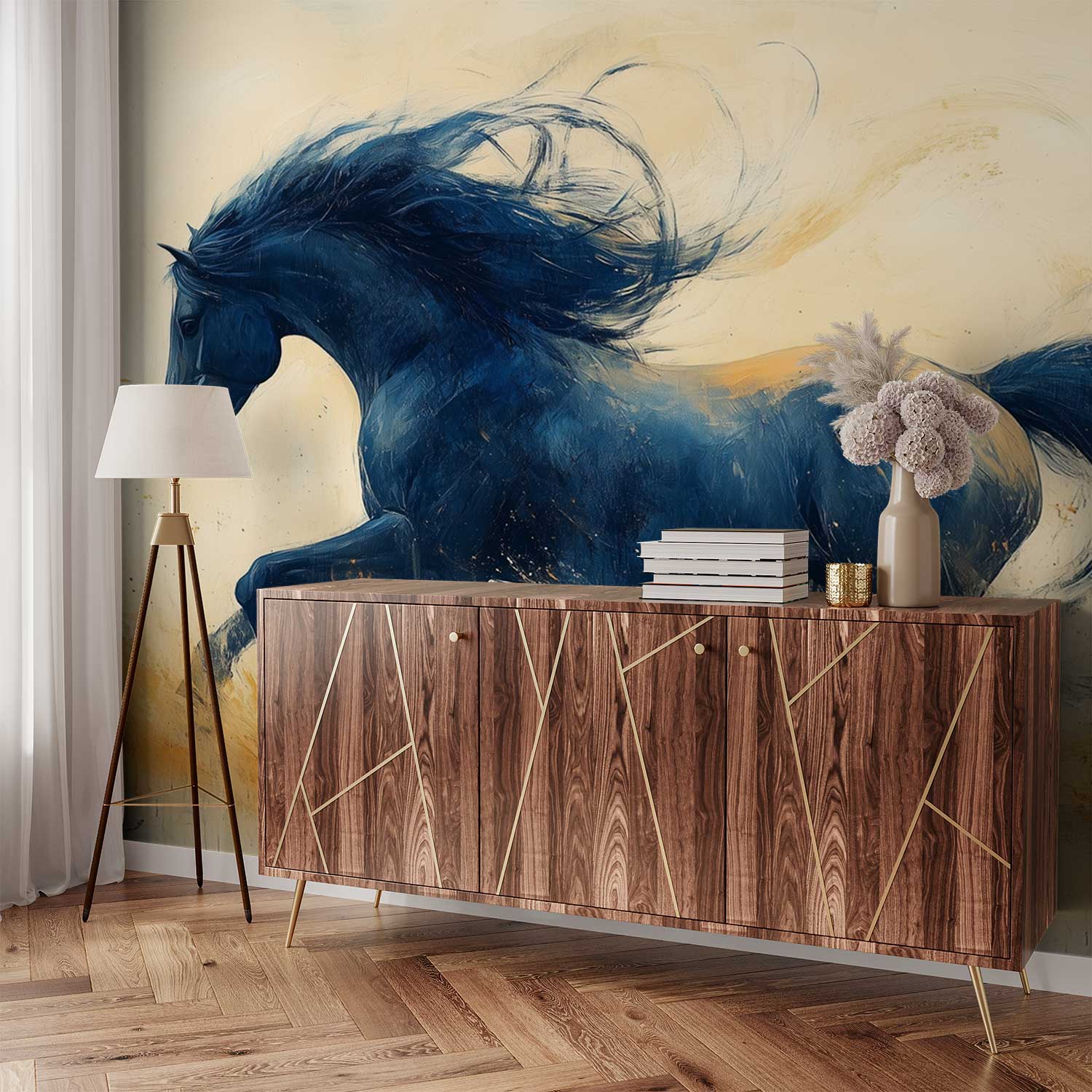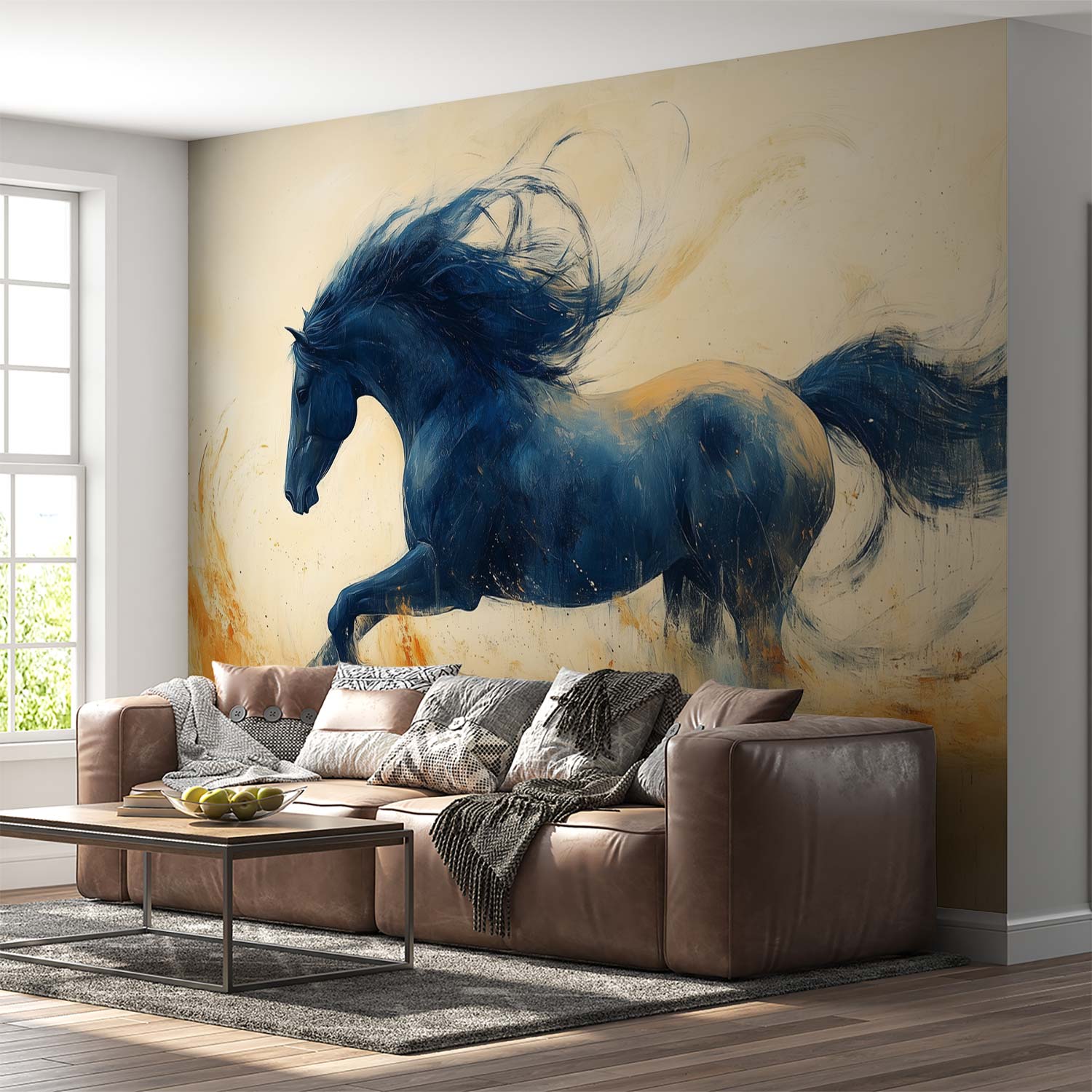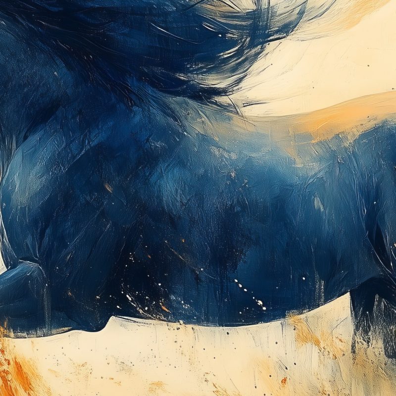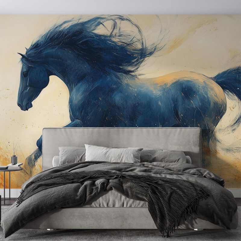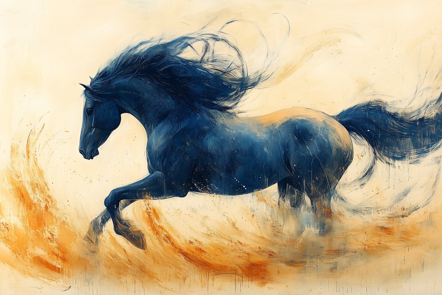 Vurige oranje en gele tinten vangen de dynamische galop van dit krachtige zwarte paard. Zijn wapperende manen en zwevende hoeven stralen pure energie uit. Dit levendige kunstwerk brengt beweging en vrijheid in je ruimte, perfect als statementwand die zowel elegantie als passie toevoegt. De meeslepende sfeer transformeert elke kamer in een theatrale omgeving vol emotie en karakter.
