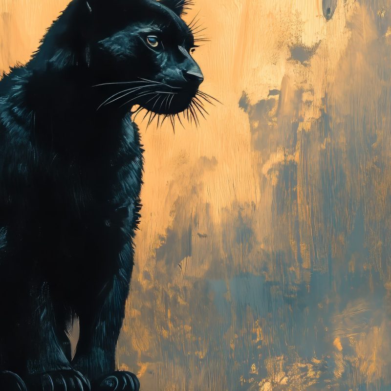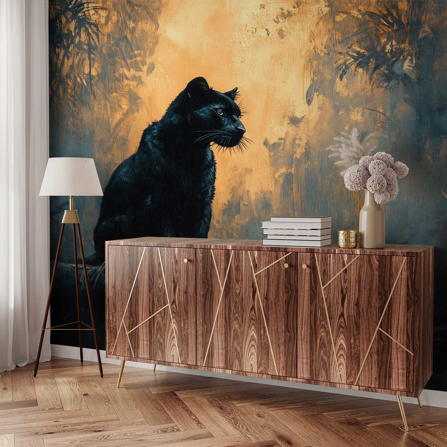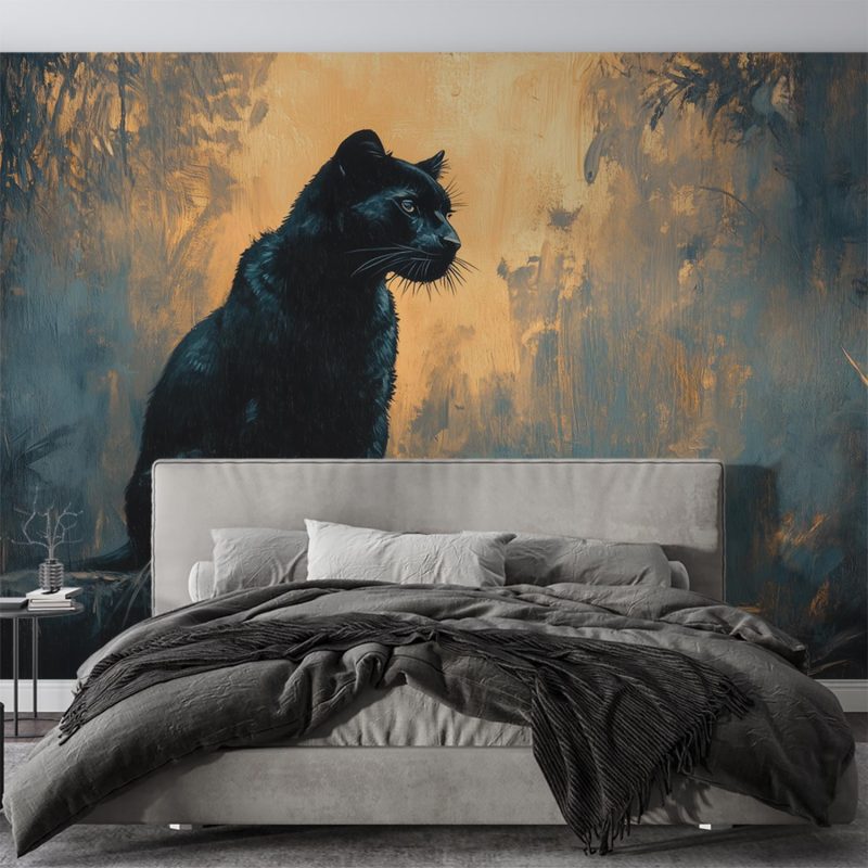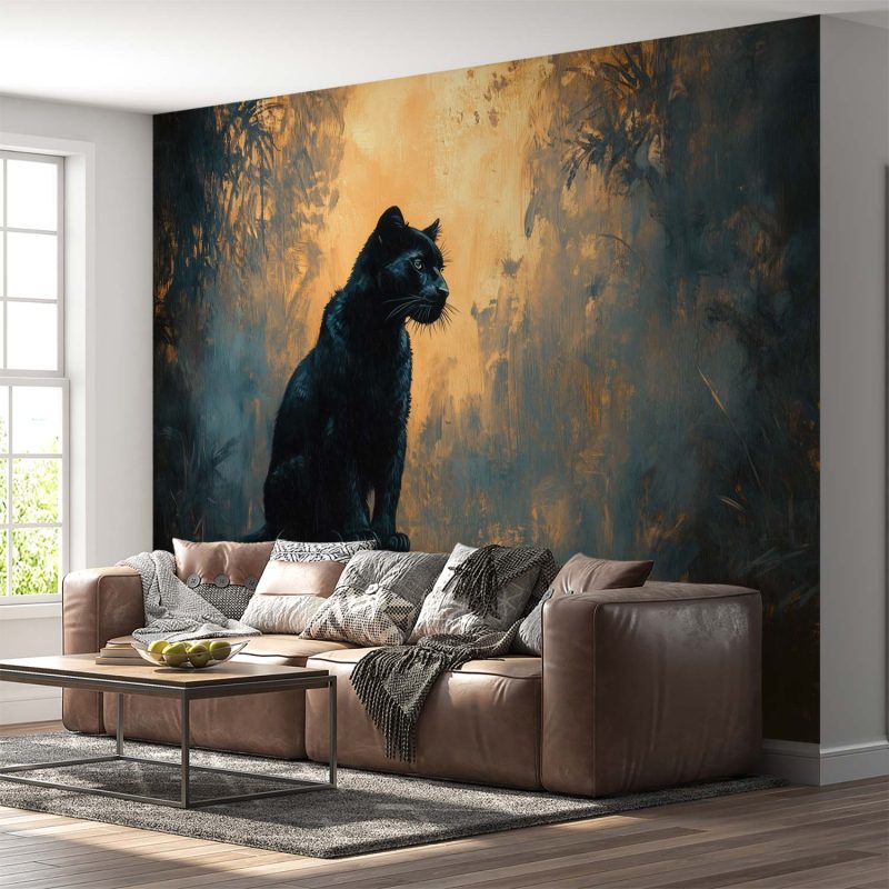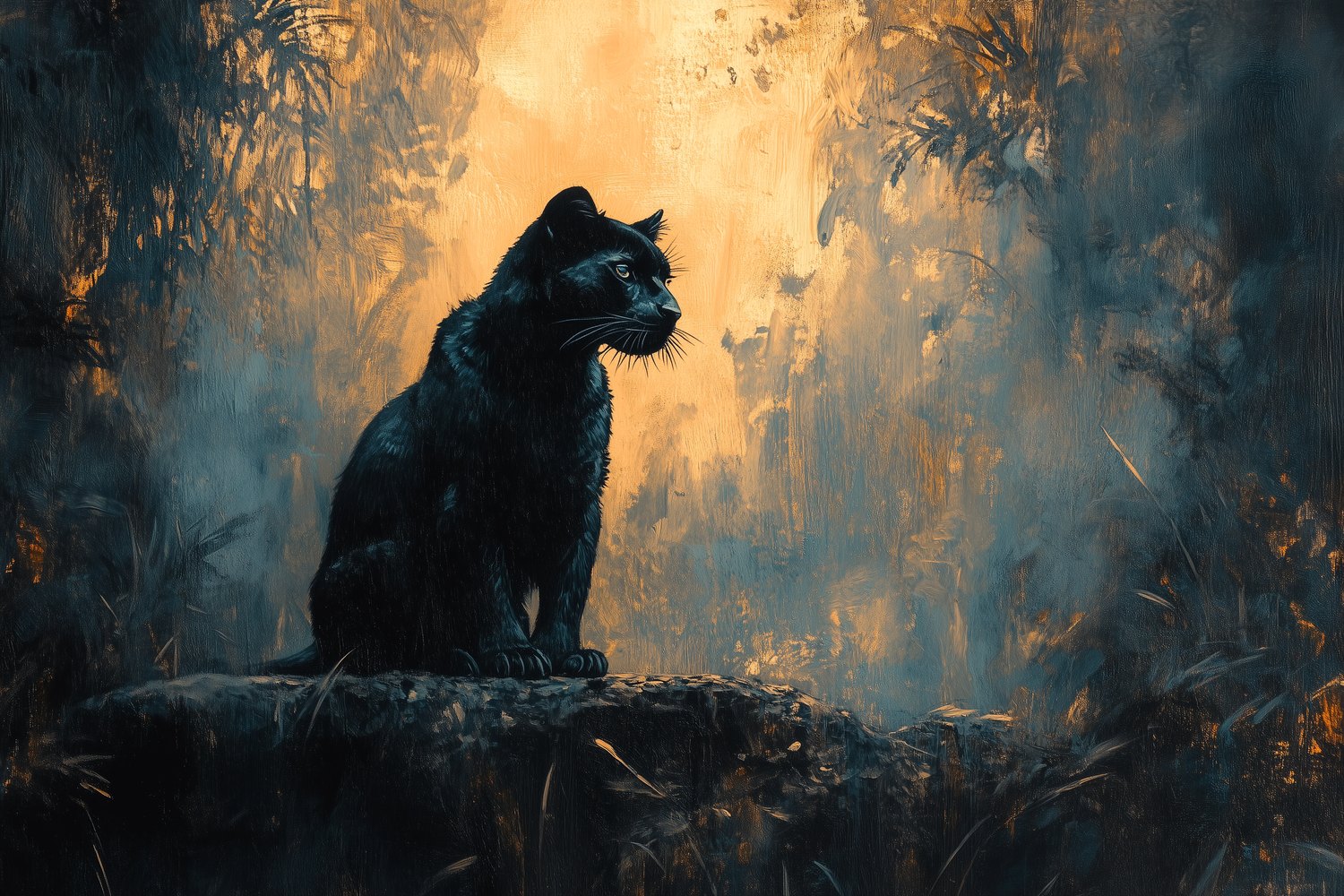 Duistere mystiek doordringt dit indringende boslandschap. Een zwarte panter rust op een rots, omringd door weelderig groen. Zijn aanwezigheid domineert het doek vol diepe tinten zwart en bruin. Deze raadselachtige sfeer brengt avontuur en diepte in je interieur, perfect voor wie verfijnde dramatiek zoekt. De intense blik van het dier vertelt een verhaal dat je elke dag opnieuw wilt ontdekken.
