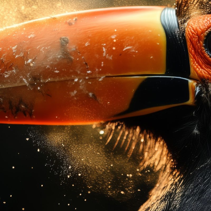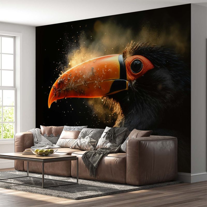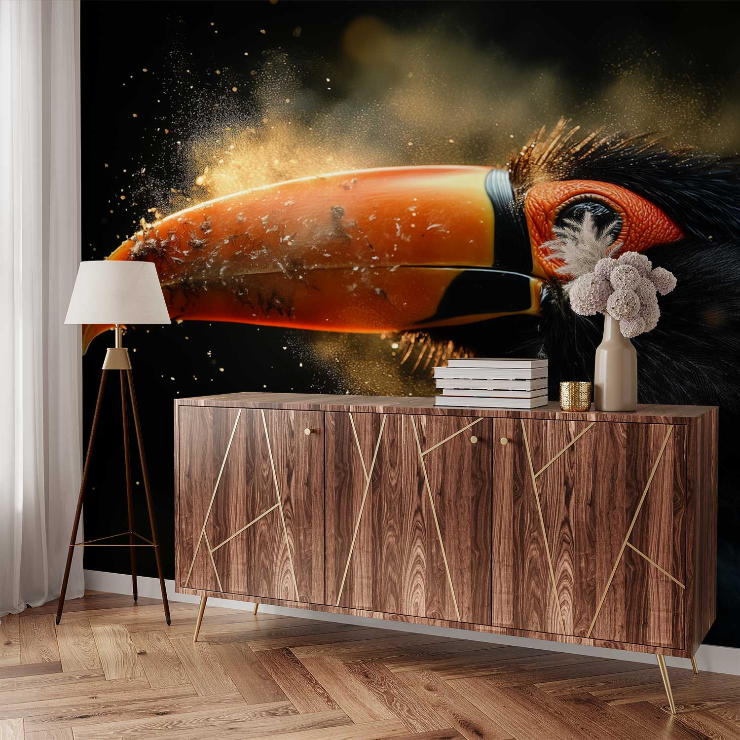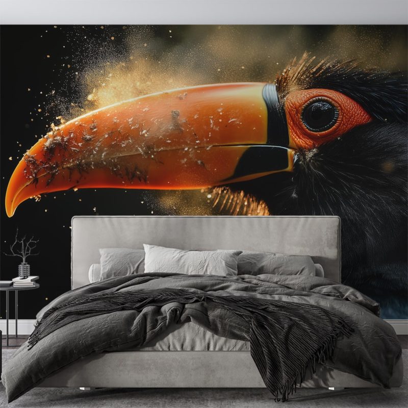 Vurig oranje breekt door het donker terwijl deze vogel in volle vaart lijkt te zweven. Zijn zwarte verenkleed fonkelt vol leven, een kunstzinnig moment van pure energie. Dit behang brengt een wild en dynamisch accent in je ruimte, perfect voor wie houdt van een statement vol contrast en beweging.