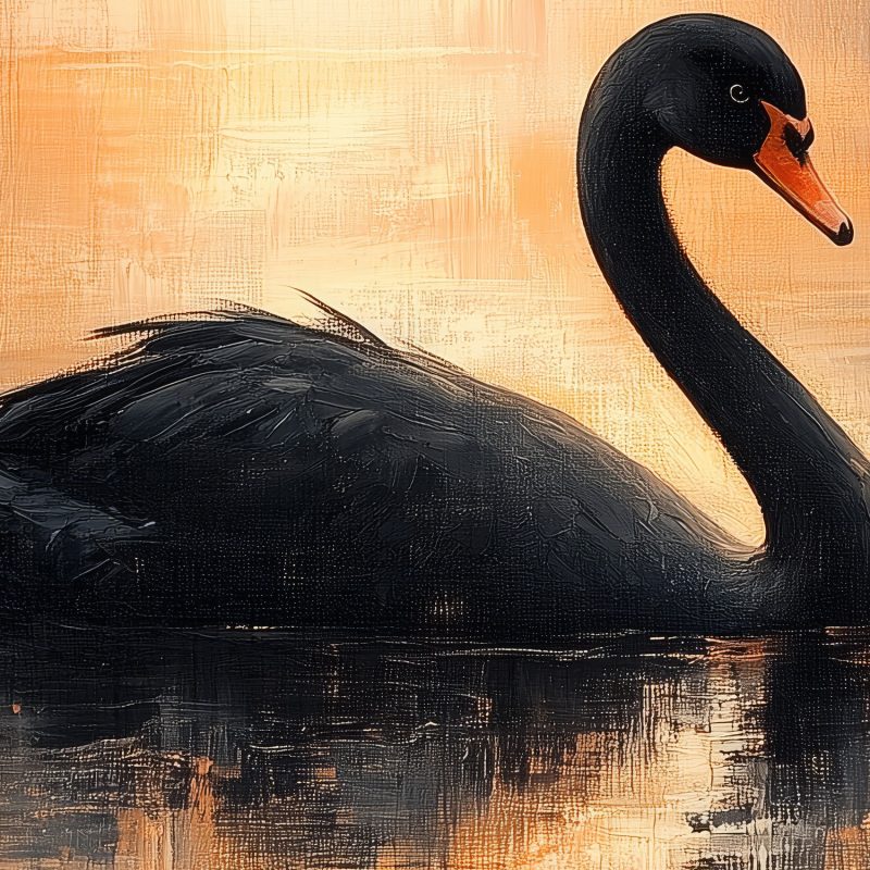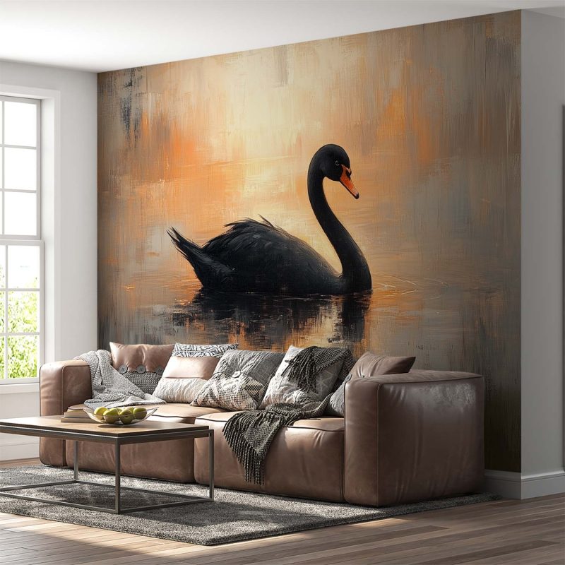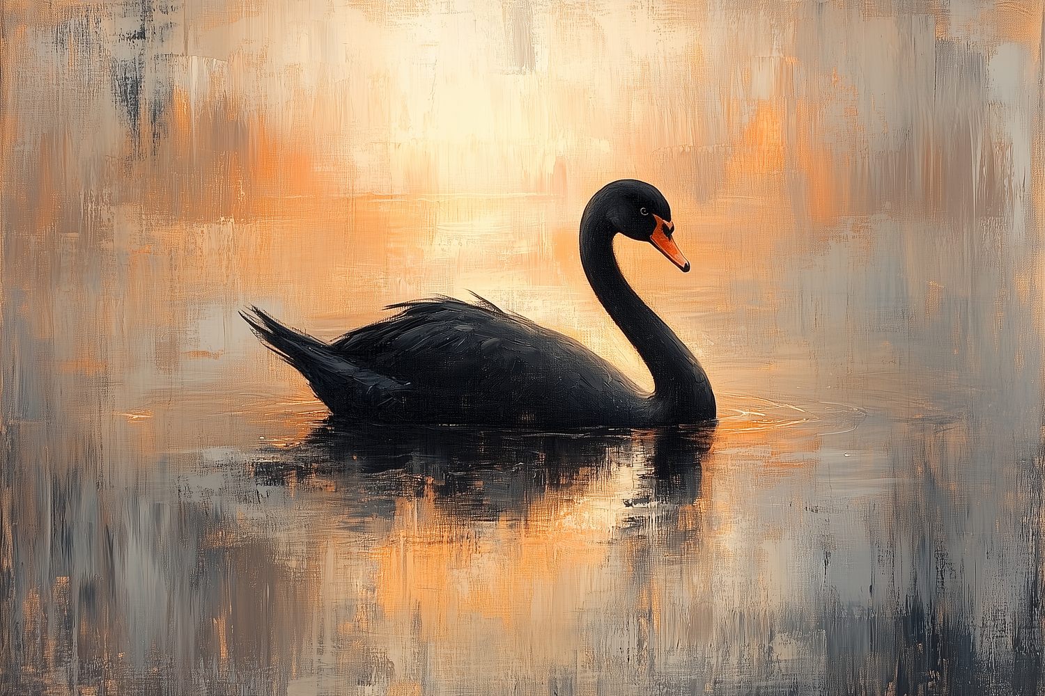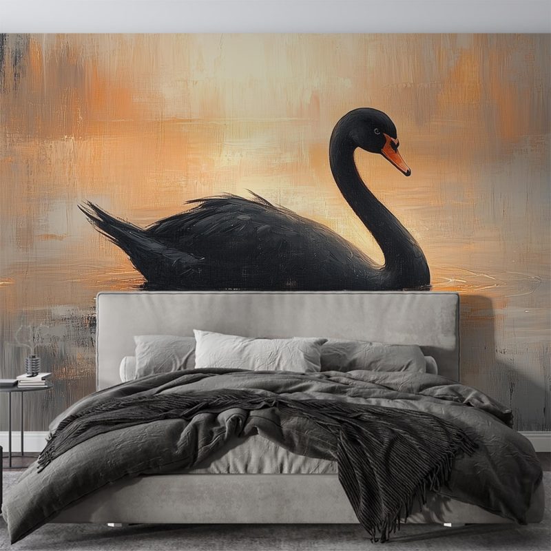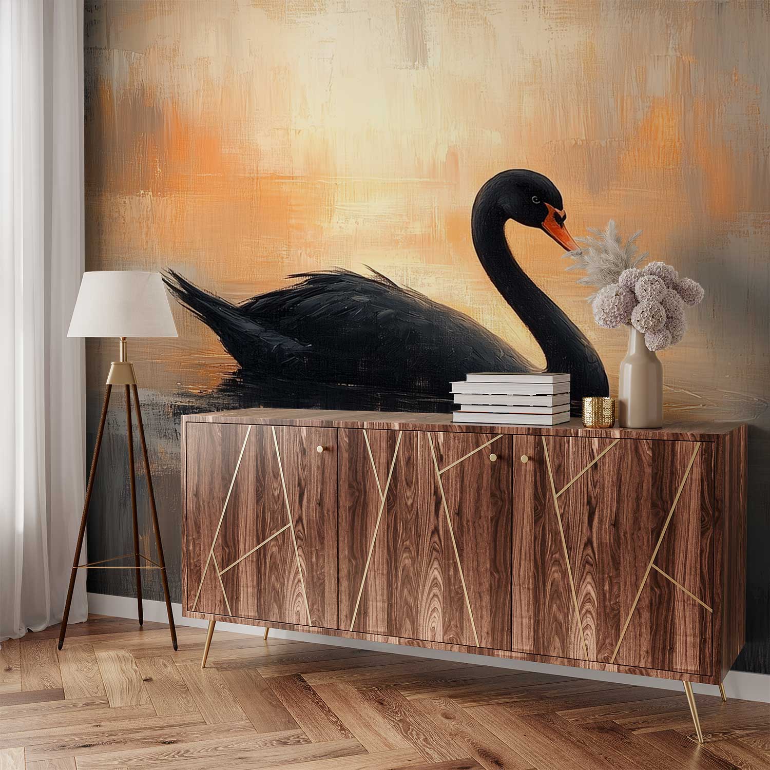 Zachte penseelstreken dansen in warm oranje en grijs, waar een sierlijke zwarte zwaan door het water glijdt. Dit impressionistische tafereel ademt rust en elegantie, perfect om een serene sfeer in uw interieur te creëren. De harmonieuze compositie brengt natuurlijke gratie in elke ruimte, ideaal voor een rustpunt in moderne of klassieke omgevingen.