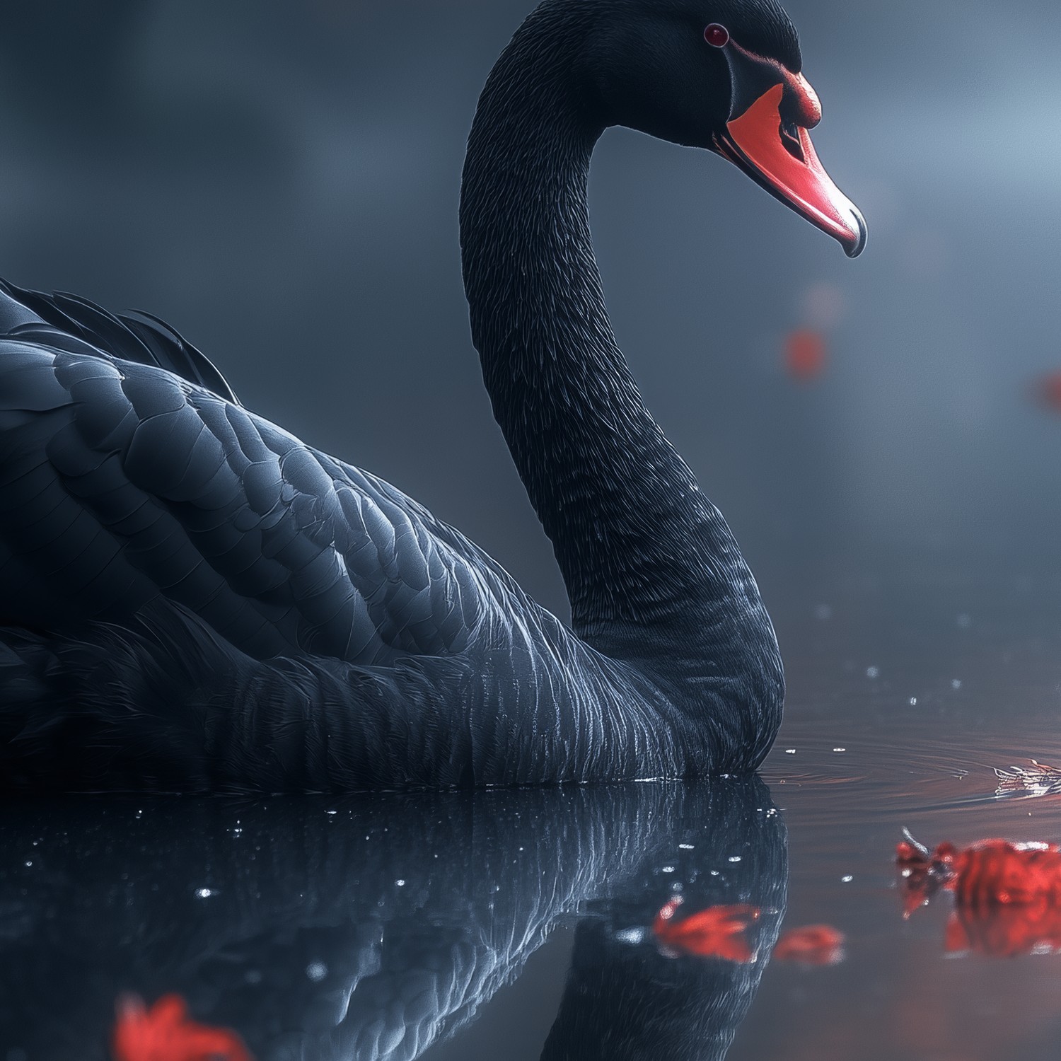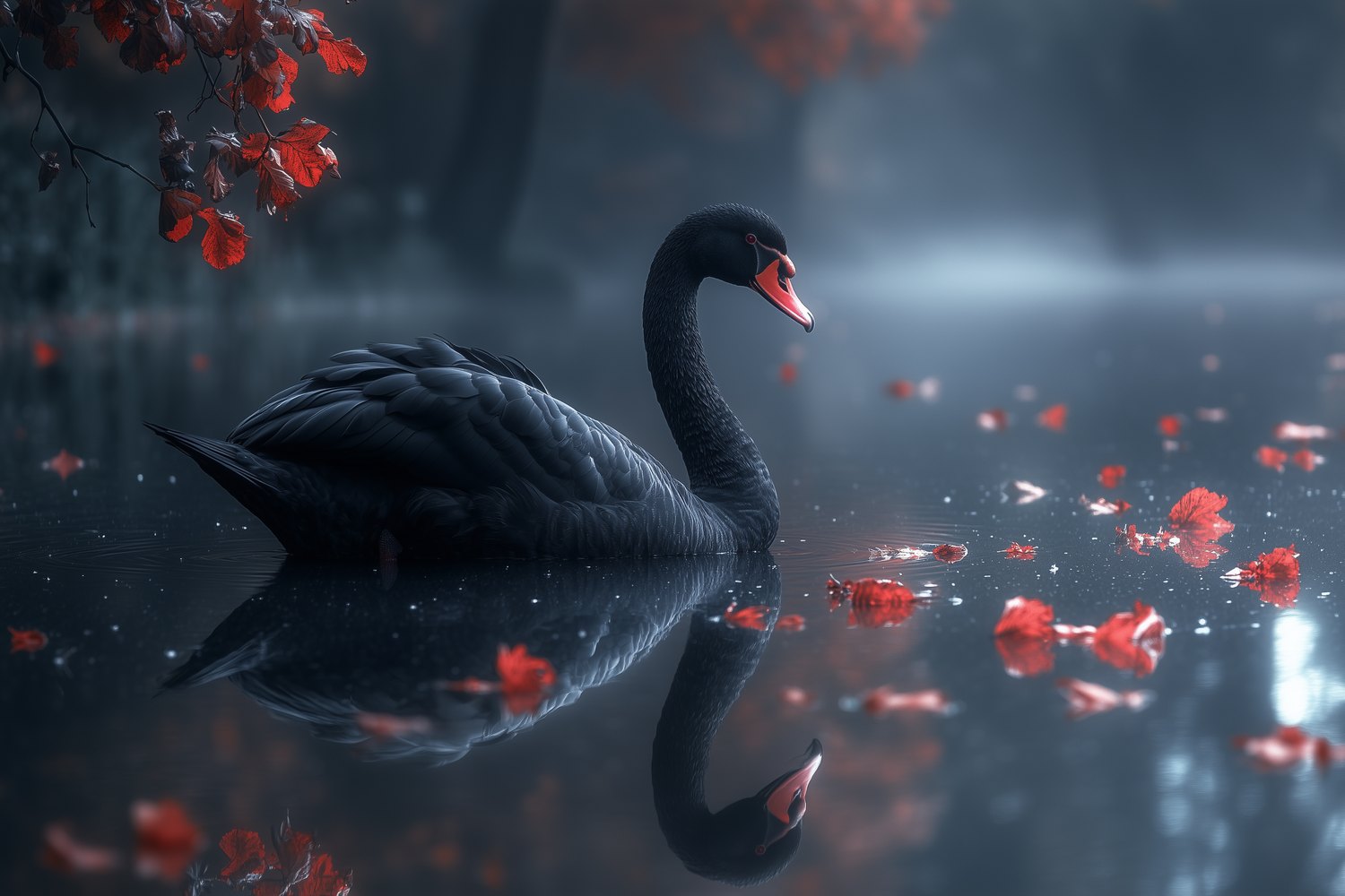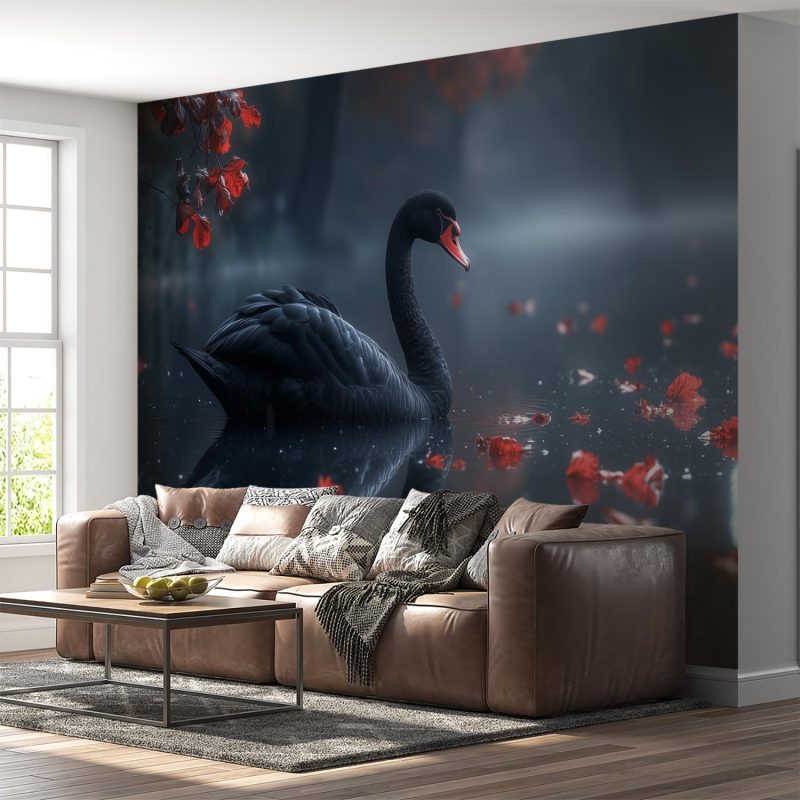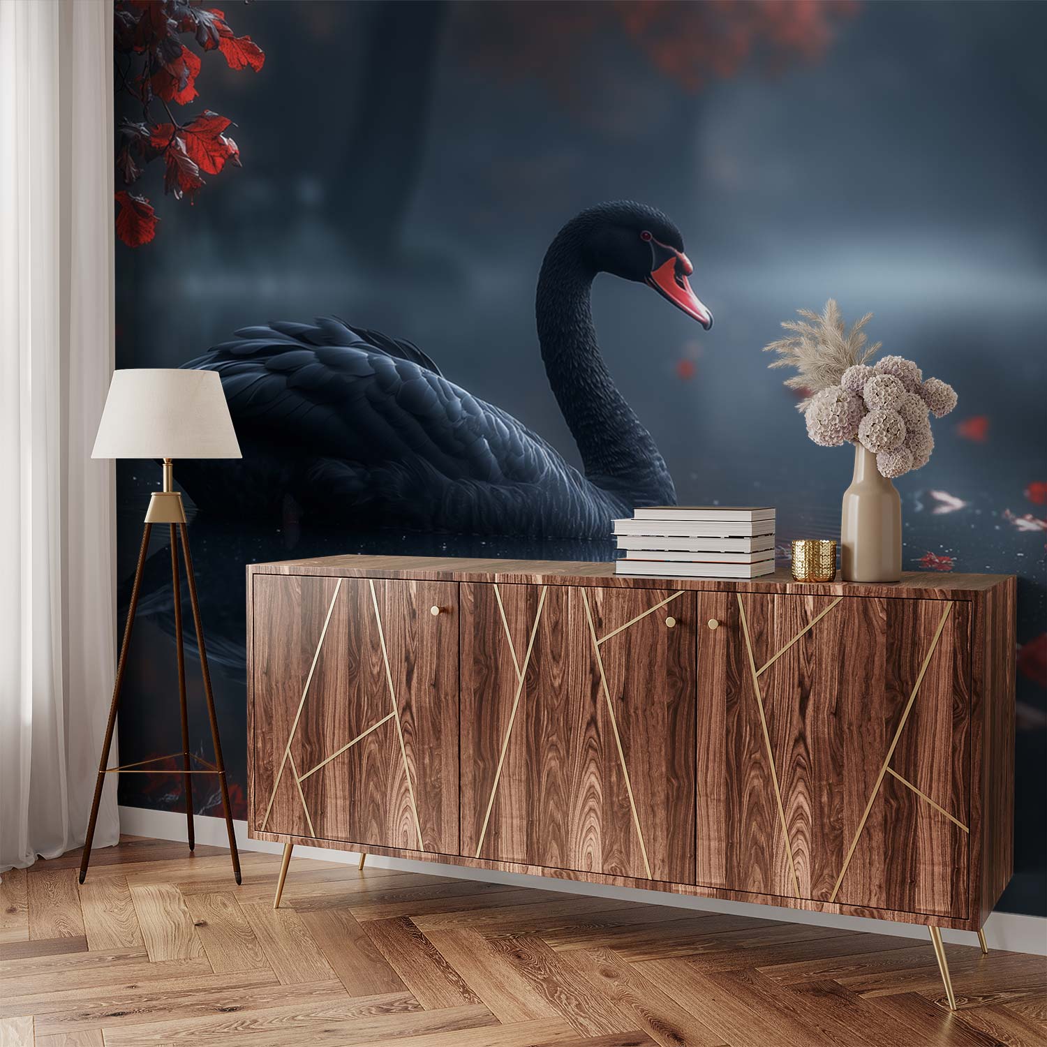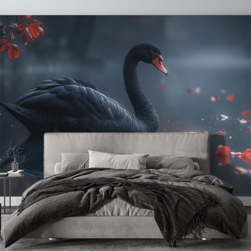 Zachtjes drijft een zwarte zwaan over het donkerblauwe water, omringd door karmozijnrode bladeren. Zijn volmaakte reflectie weerspiegelt de serene sfeer. Dit levendige tafereel brengt rust en natuurlijke elegantie in uw ruimte, waarbij de harmonieuze compositie zorgt voor een kalmerende, visueel verrijkende achtergrond die elke kamer transformeert.
